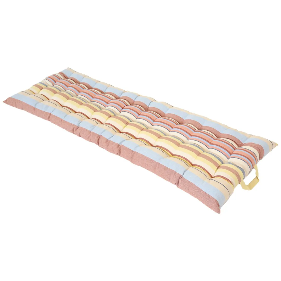 Maak van je tuinbankje een gezellige en comfortabele plek met dit langwerpige kussen met gekleurde strepen. Of ga lekker op het kussen op de grond of in het gras zitten. Leuk om te combineren met onze tuinkussens in hetzelfde dessin.