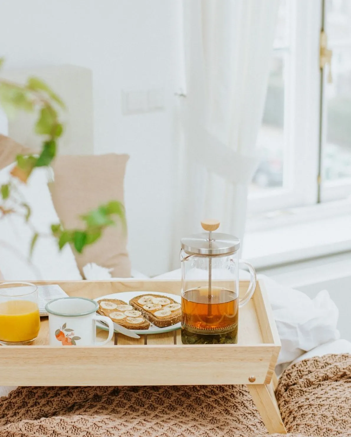 Bedtafeltje met twee handvatten en uitklapbare pootjes. Stabiel en met opstaande rand, waardoor de spullen er niet vanaf glijden. Ideaal voor ontbijt op bed.