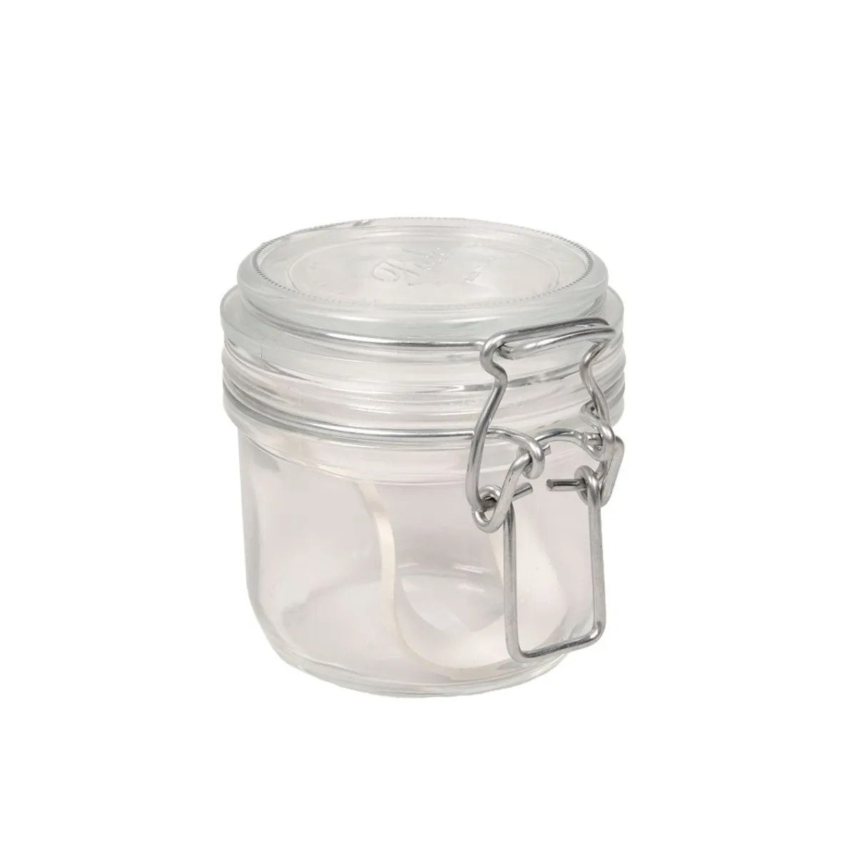 Glazen pot met beugelsluiting. Ideaal voor het luchtdicht opbergen van bv. rijst. Ook voor het op alcohol of siroop bewaren van vruchten. Geschikt voor de vriezer en de afwasmachine. Afmetingen Ø 7,5,hoogte 8,5 cm. Opening Ø 6,8 cm.