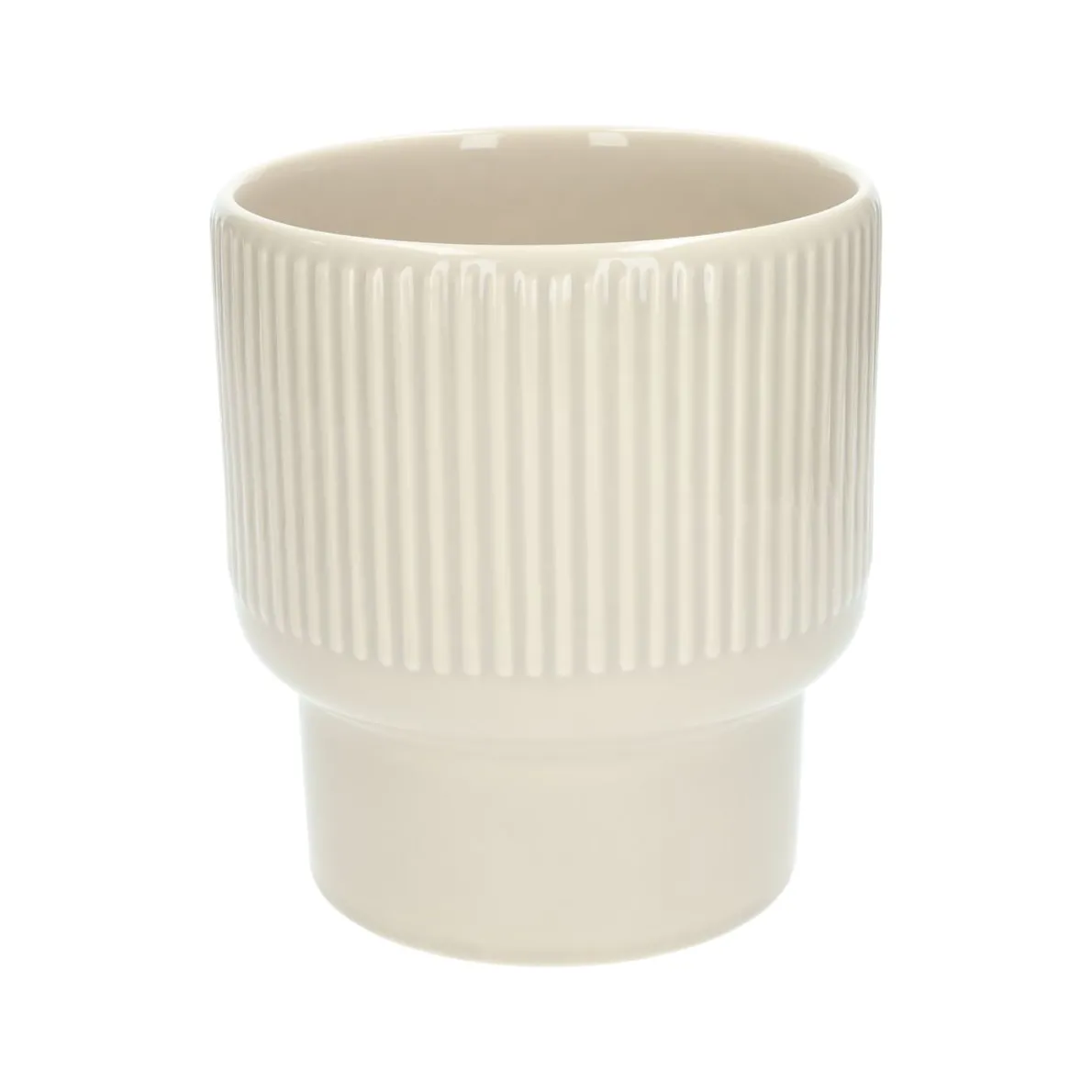Een mooie plant komt in deze stijlvolle bloempot nóg beter tot zijn recht. De bijzondere vorm en fijne ribbelstructuur geven de pot karakter. Hij is gemaakt van aardewerk en afgewerkt met reactief glazuur in een elegante, lichtbeige tint. Combineer meerdere potten in verschillende maten en kleuren voor een speels effect.