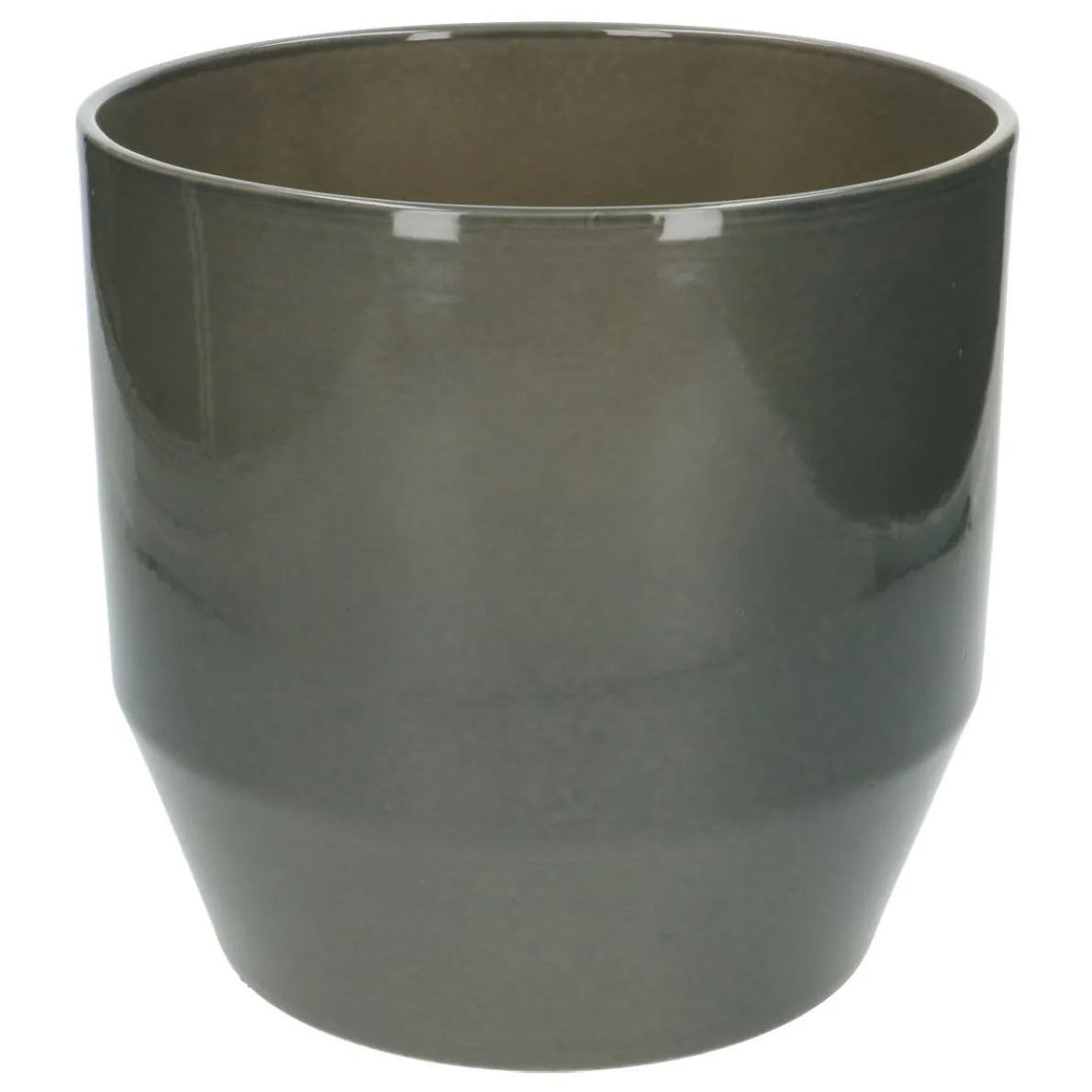 Grote, ietwat taps aflopende groengrijs gekleurde bloempot.