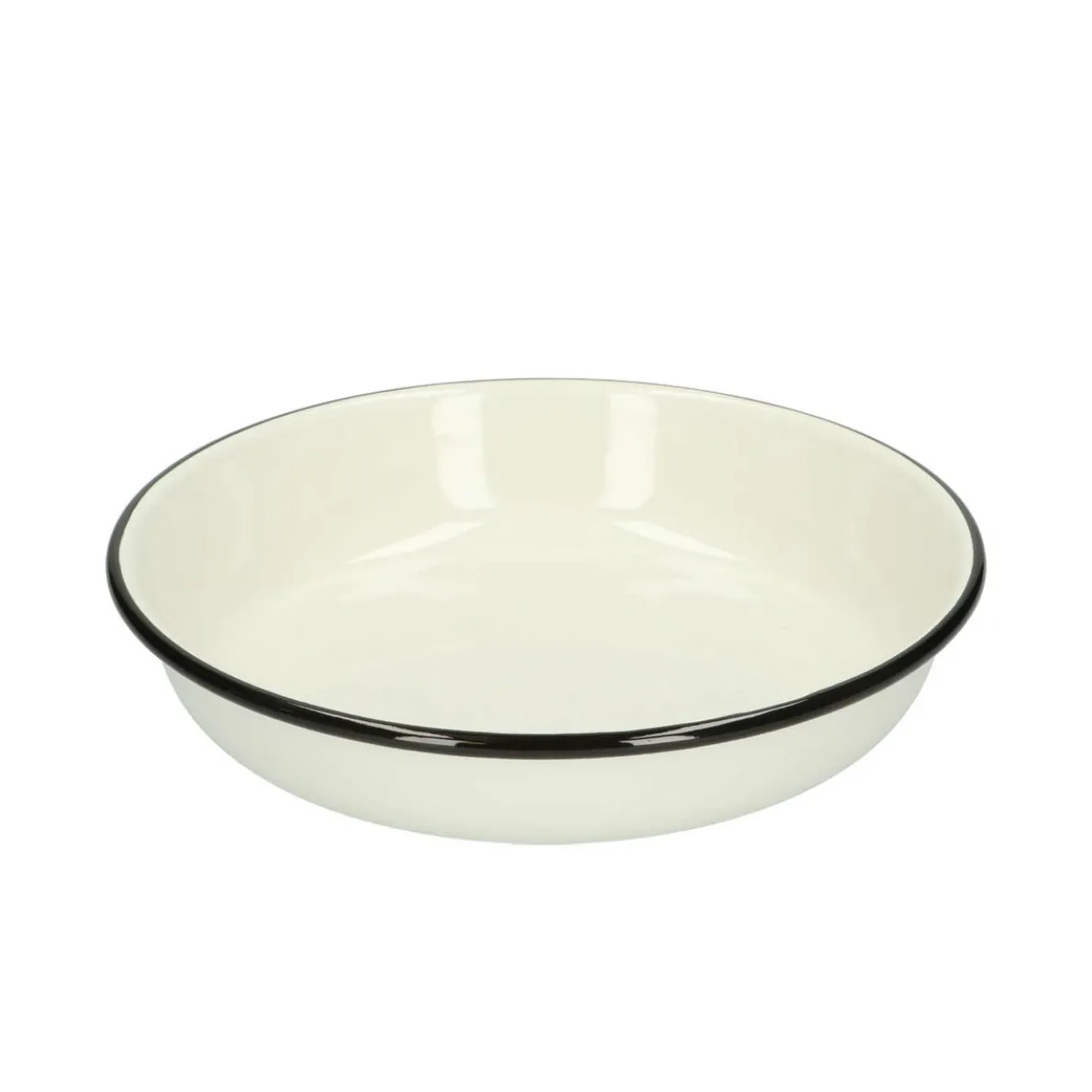Geef een nostalgisch tintje aan je gedekte tafel met servies van emaille. Dit diepe witte bord met zwarte rand bijvoorbeeld. Ook goed te gebruiken bij een barbecue, op de camping of bij een picknick.