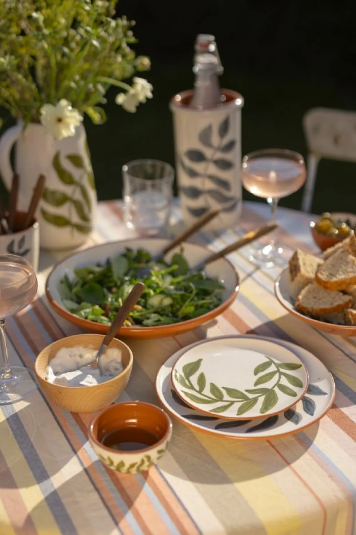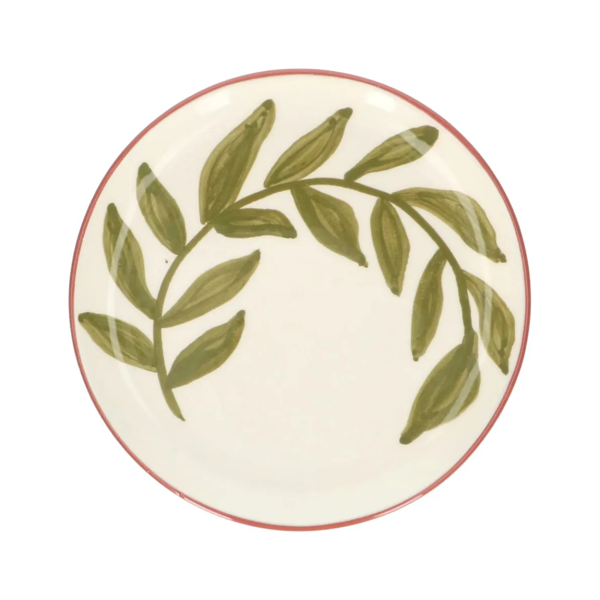 Dit bord is onderdeel van een serviesserie. Een zomers servies van geglazuurd terracotta, gemaakt en handgeschilderd in Portugal. Met dit servies creëer je een warme Mediterrane sfeer op tafel. Het bord heeft een geglazuurde crèmekleurige binnenkant en een terracotta buitenkant. Erg mooi in combinatie met de andere onderdelen van dit servies en leuk om te gebruiken met bijv. onze kommetjes en serveerplanken van hout. Het dessin is een eigen ontwerp van Dille & Kamille.