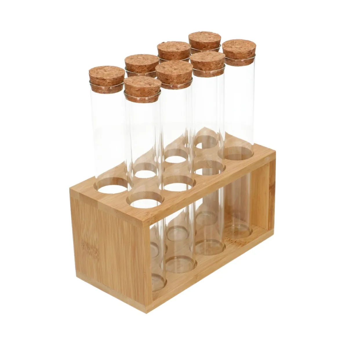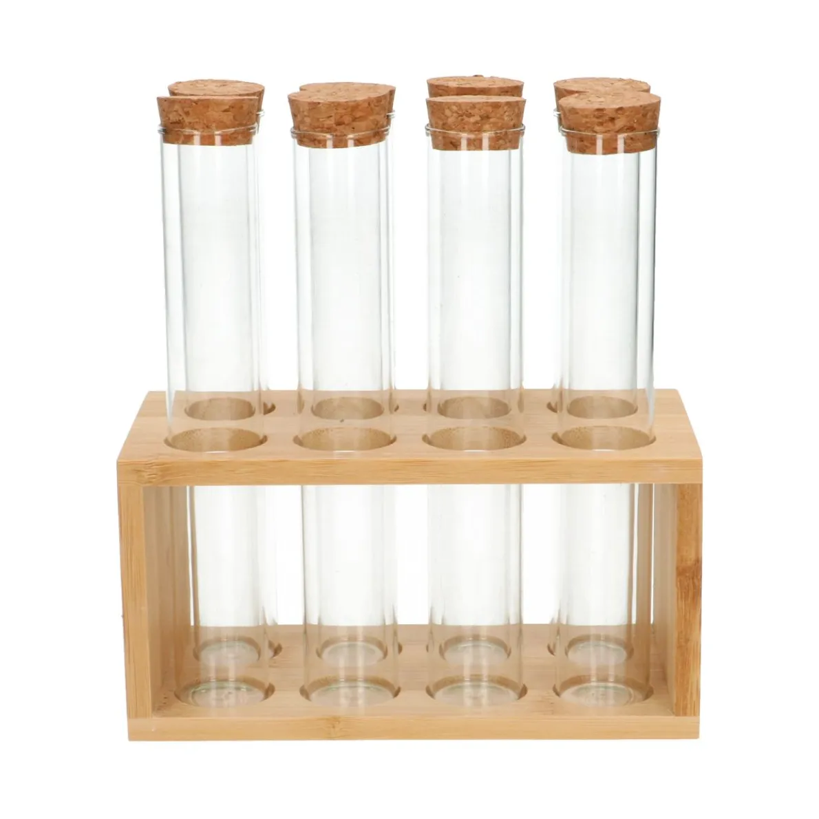 Deze glazen buisjes zijn perfect om te vullen met bijvoorbeeld verschillende soorten thee of kruiden. Ze staan stevig in de standaard van bamboe, zijn gemaakt van hittebestendig glas en sluiten goed af met een kurk. Handig voor in de keuken of zet de houder op tafel om specerijen, olie of azijn in te presenteren tijdens een etentje. Ook leuk om gevuld cadeau te doen.
