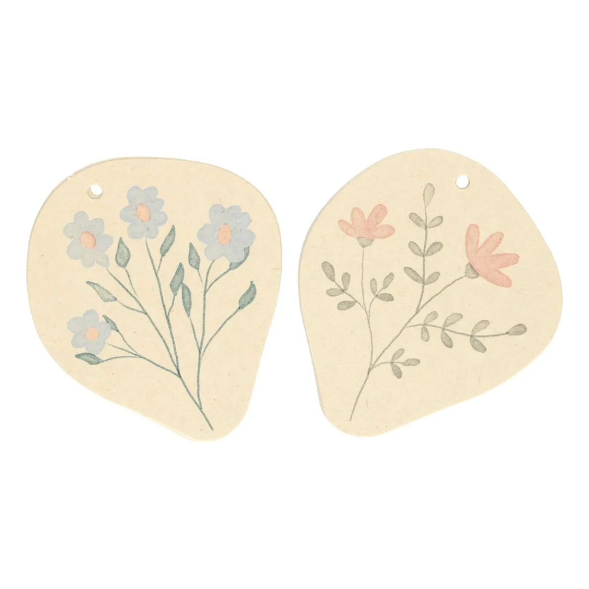 Leuke labels, met een blauwe of roze bloem. Leuk om met een jute touwtje of stukje raffia aan een cadeautje te hangen. Ook mooi als naamkaartje aan een servet op tafel.