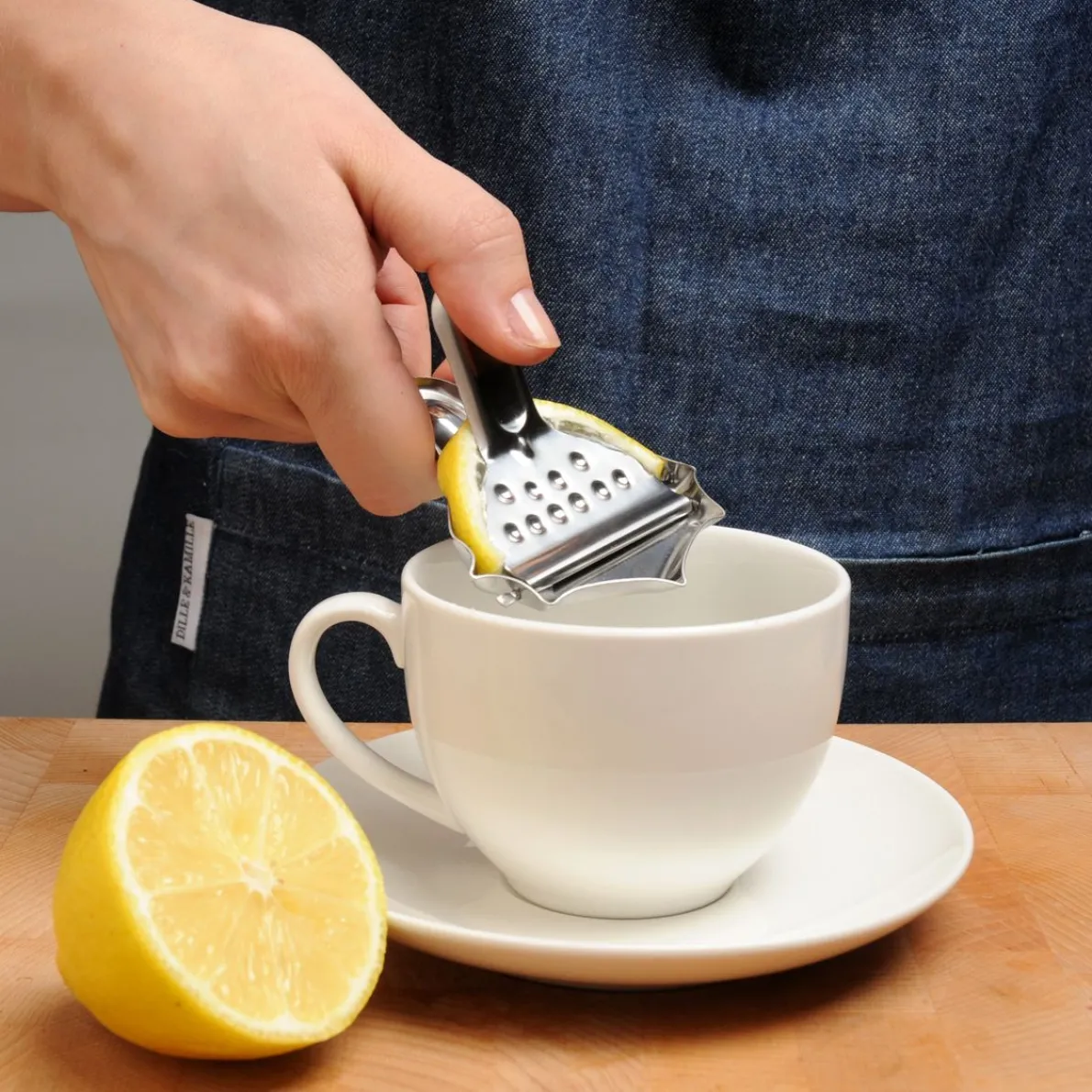Roestvrij stalen knijpertje voor een schijfje citroen. Voor bij een kopje thee, maar bv. ook om bij een visgerecht te serveren. Geschikt voor de afwasmachine.