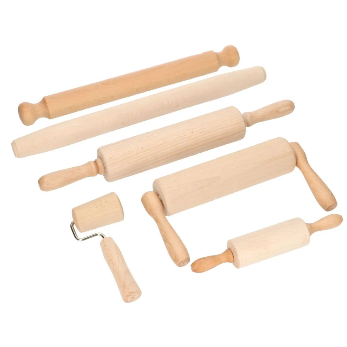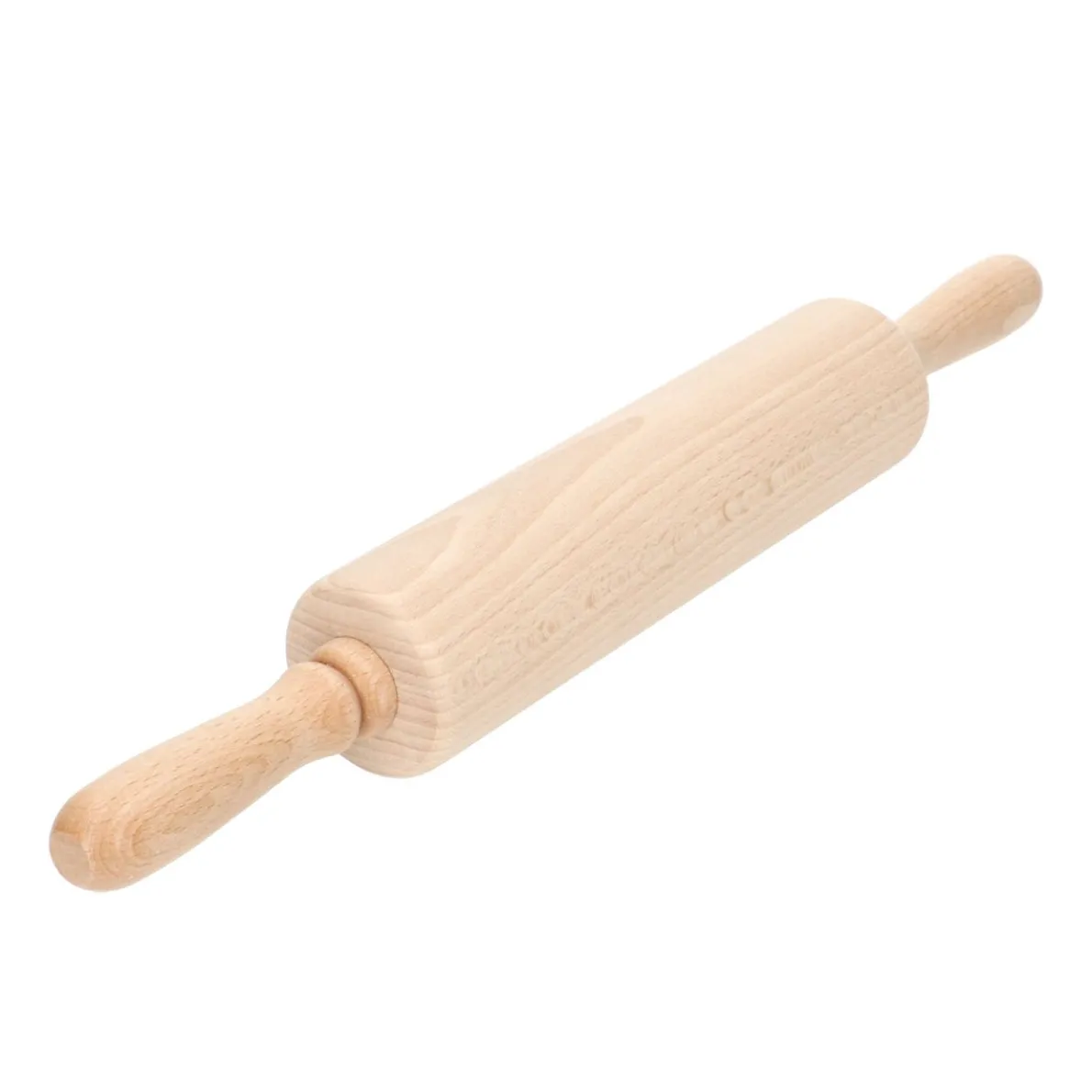 Deegroller van beukenhout met FSC-keurmerk. Het uitrollen van het deeg wordt extra makkelijk gemaakt doordat het rolgedeelte apart draait van de twee handvatten. Lengte 43 cm, dikte 5,5 cm.