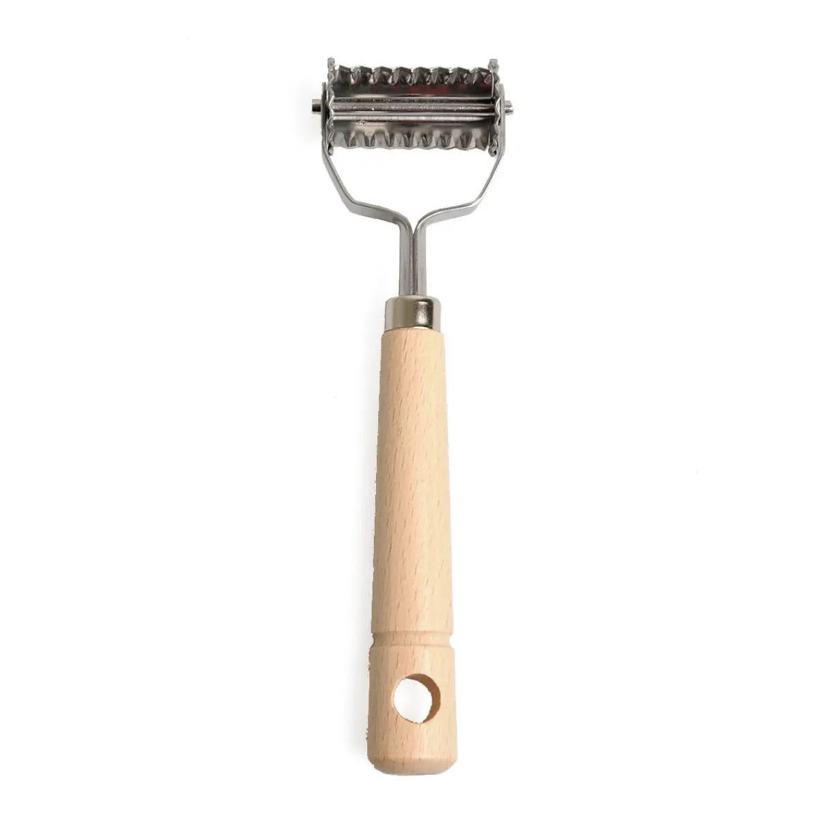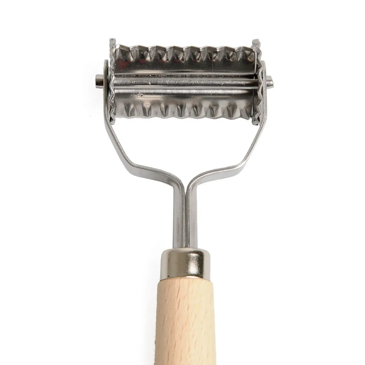 Deegwieltje van verzinkt metaal met beukenhouten handvat. Voor het decoratief uitsnijden van stukjes deeg. Door de vorm ideaal voor het uitsnijden van bv. pastadeeg (Farfalle). Niet geschikt voor de afwasmachine. Totale lengte 18,5 cm.