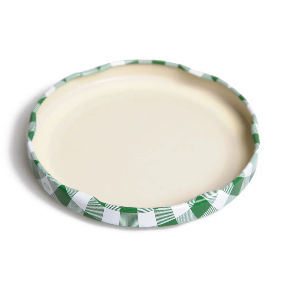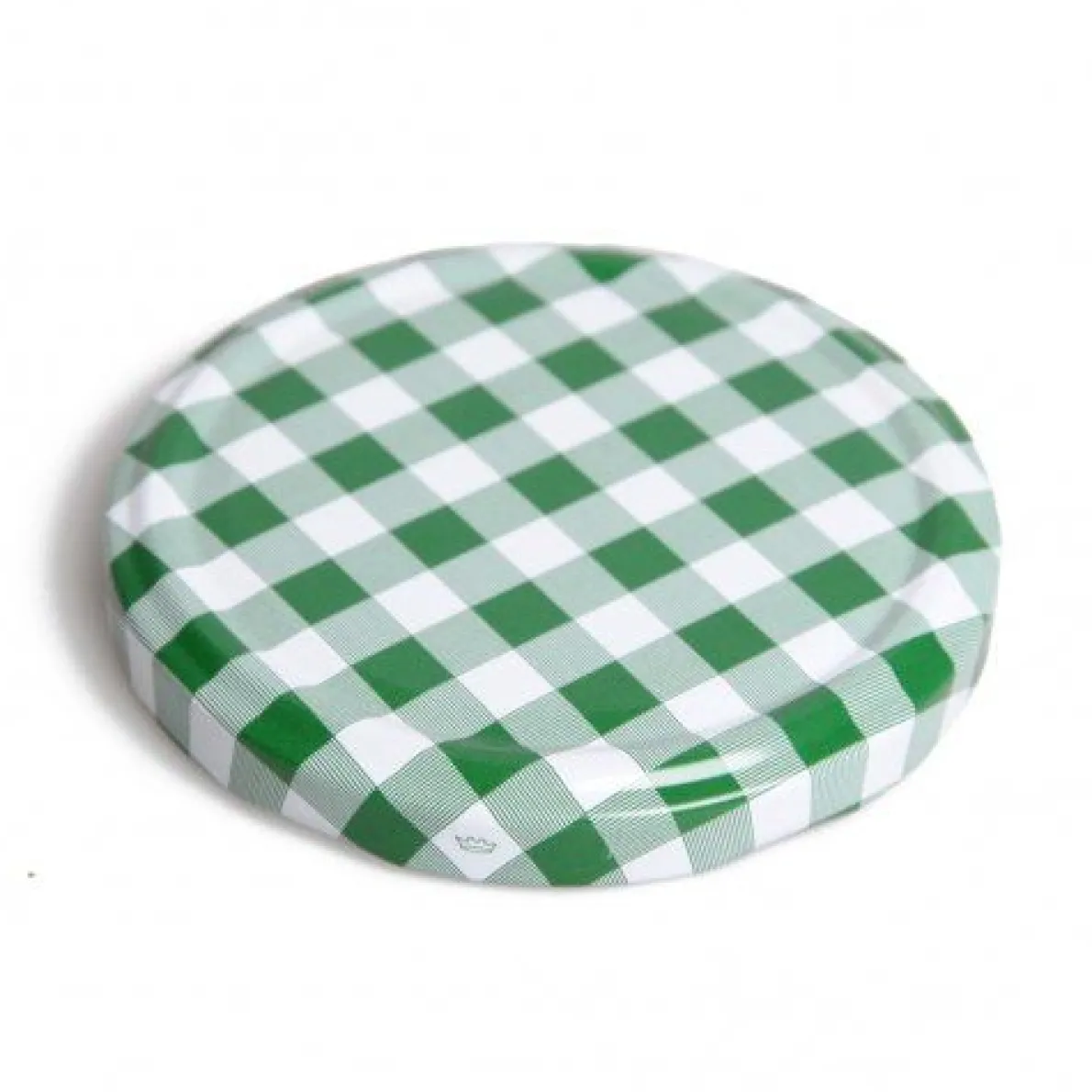 Metalen deksel, groen/wit geruit, geschikt voor inmaakpot glad en inmaakpot met facetten in alle maten. De deksels zijn bij het wecken 1 keer te gebruiken. Hoogte 1 cm, Ø 8 cm.
