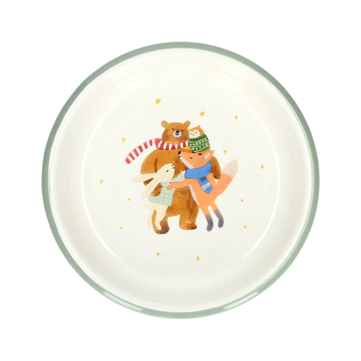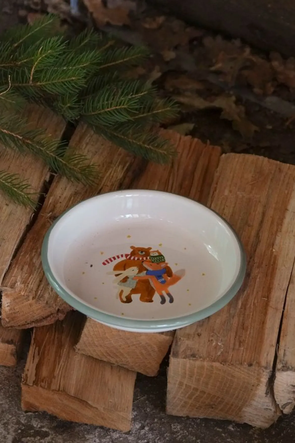 Lief emaillen bord/schaaltje, bedrukt met knuffelende dieren. Leuk voor bijvoorbeeld het kerstontbijt en om allerlei lekkers op te serveren. De ondergrond is offwhite, het bord heeft een grijsgroen randje. De afbeelding is speciaal ontworpen voor Dille & Kamille.