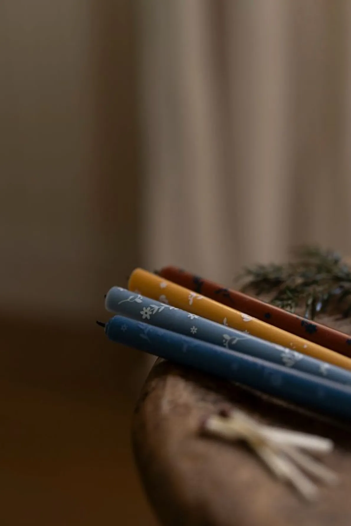 Set van 4 dunne kaarsen in twee tinten blauw en in een gele en rode tint. De kaarsen zijn bedrukt met fijne takjes en stippen en verpakt in een kartonnen doosje.