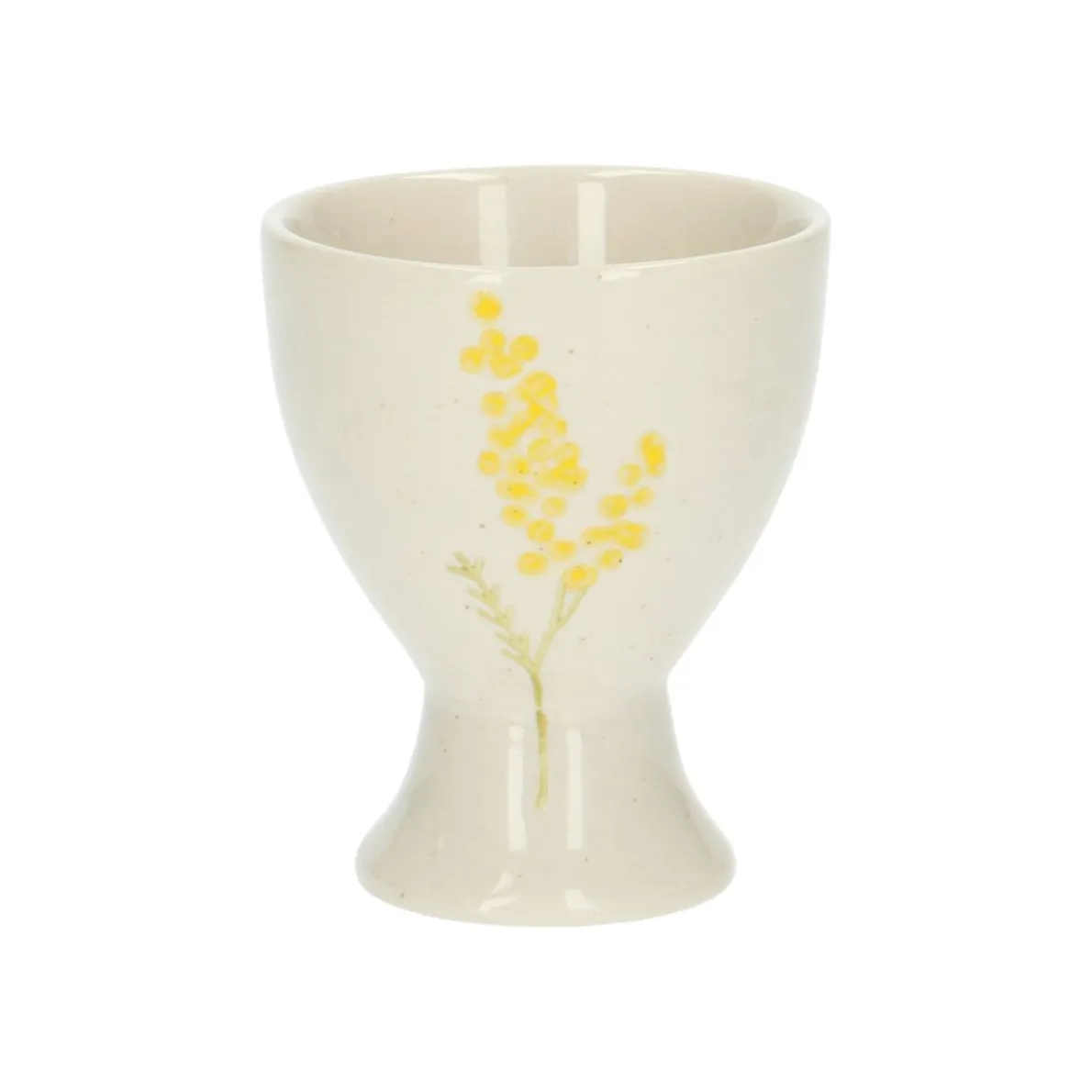 Dit eierdopje is onderdeel van een serviesreeks. Een mimosa servies van steengoed met beige basisglazuur en bruine spikkels. Het mimosapatroon wordt handmatig met een stempel op het servies gedrukt. Het gestempelde gedeelte krijgt een waslaag en daarna een transparante glazuurlaag. In de oven smelt de was weg en zo ontstaat een subtiel reliëf en voelen de illustraties wat ruw aan. Het dessin is een eigen ontwerp van Dille & Kamille! Mooi om te combineren met de andere onderdelen van dit servies.