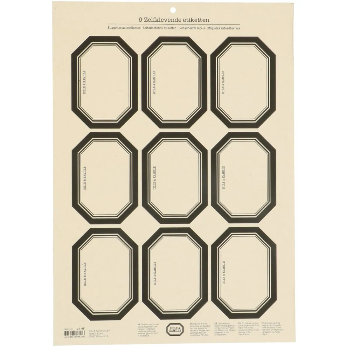 Nostalgische etiketten in de vorm van het Dille & Kamille logo, om bijvoorbeeld op je voorraadpotten zelfgemaakte jams en chutneys, schriften en schetsboeken te plakken. Met zwarte rand en in kleine letters ‘Dille & Kamille’ boven in het etiket. De etiketten zijn eenvoudig te beschrijven met pen, potlood of stift.