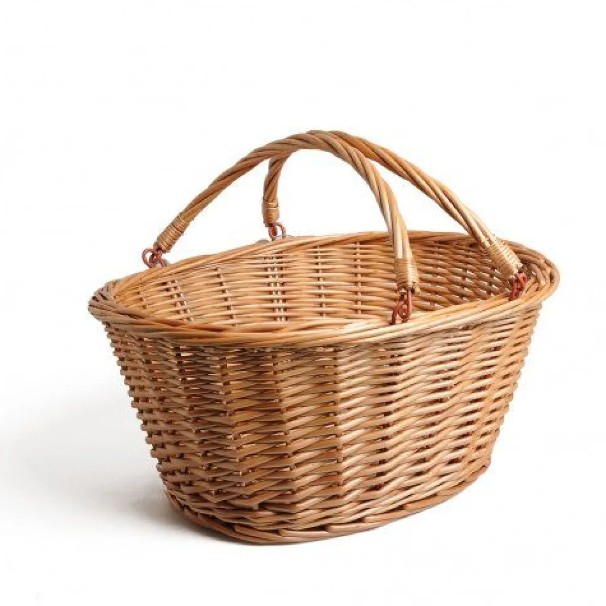 Stevige fietsmand met twee hengsels. Gemakkelijk aan het stuur te hangen en er weer af te halen dankzij de twee met plastic omhulde metalen klemhaken.