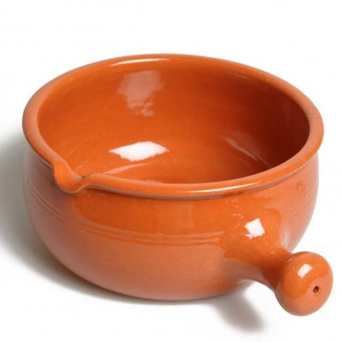 Fonduepan/caquelon met handvat en schenktuitje, van geglazuurd terracotta, ook wel rood aardewerk genoemd. Voor het bereiden en serveren van bv. kaasfondue, ook geschikt voor ovenschotels.