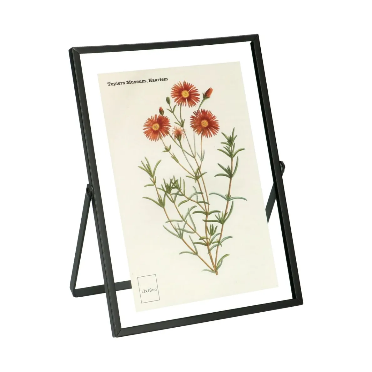 Lijstje met zwartmetalen omlijsting en 2 glaasjes die je er eenvoudig aan de bovenzijde in en uit schuift. Natuurlijk voor je mooiste foto’s, kaarten en tekeningen, maar ook prachtig met (zelf)gedroogde bloemen, veertjes en ander moois. Het dubbele glas geeft deze fotolijst een transparante, retro uitstraling.
