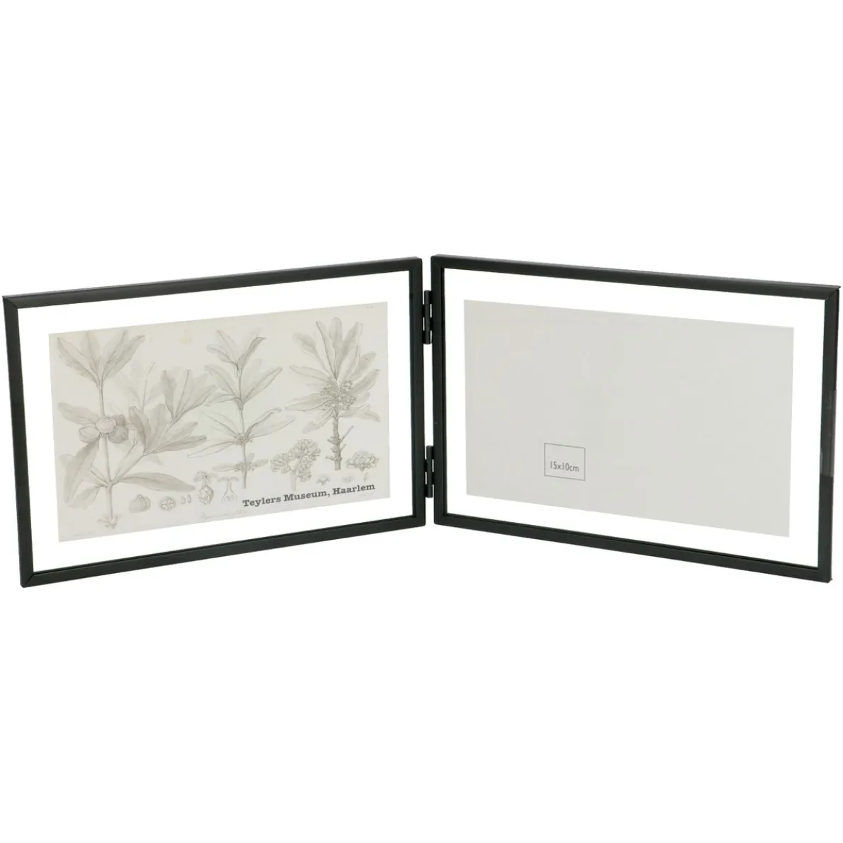 Dubbel lijstje met zwartmetalen omlijsting en per lijst 2 glaasjes die je er eenvoudig aan de bovenzijde in en uit schuift. Klem je mooiste foto’s, kaarten en tekeningen tussen de glaasjes en schuif het geheel weer terug in de lijsten. De fotolijsten zijn ook prachtig met (zelf)gedroogde bloemen, veertjes en ander moois. Het dubbele glas geeft dit fotolijstje een transparante, retro uitstraling.