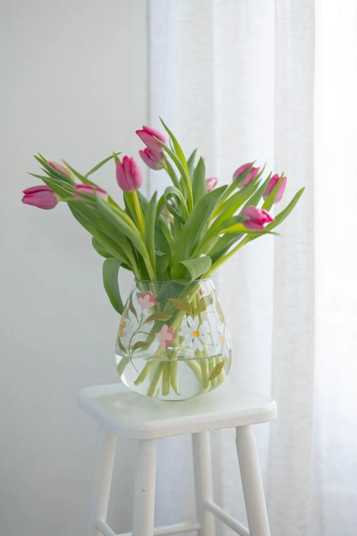 Grote tulpvormige vaas van 90% gerecycled glas. De bloemen (tulp, madelief en boterbloem) zijn er met de hand op geschilderd. Prachtig op tafel met een mooie bos bloemen of een paar bloesemtakken.