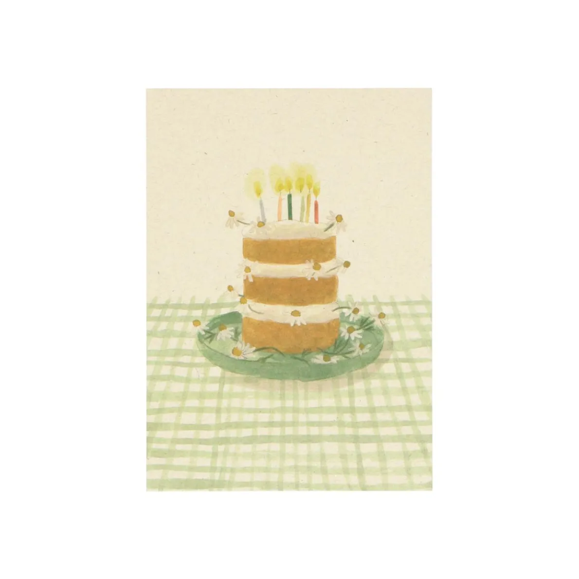 Feliciteer een jarige met deze vrolijke ansichtkaart met de afbeelding van een taart. Leuk om te versturen of om aan een cadeaupakketje te hangen.