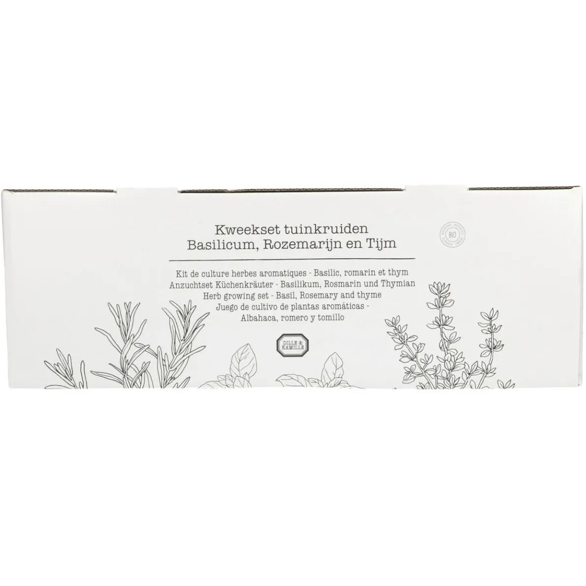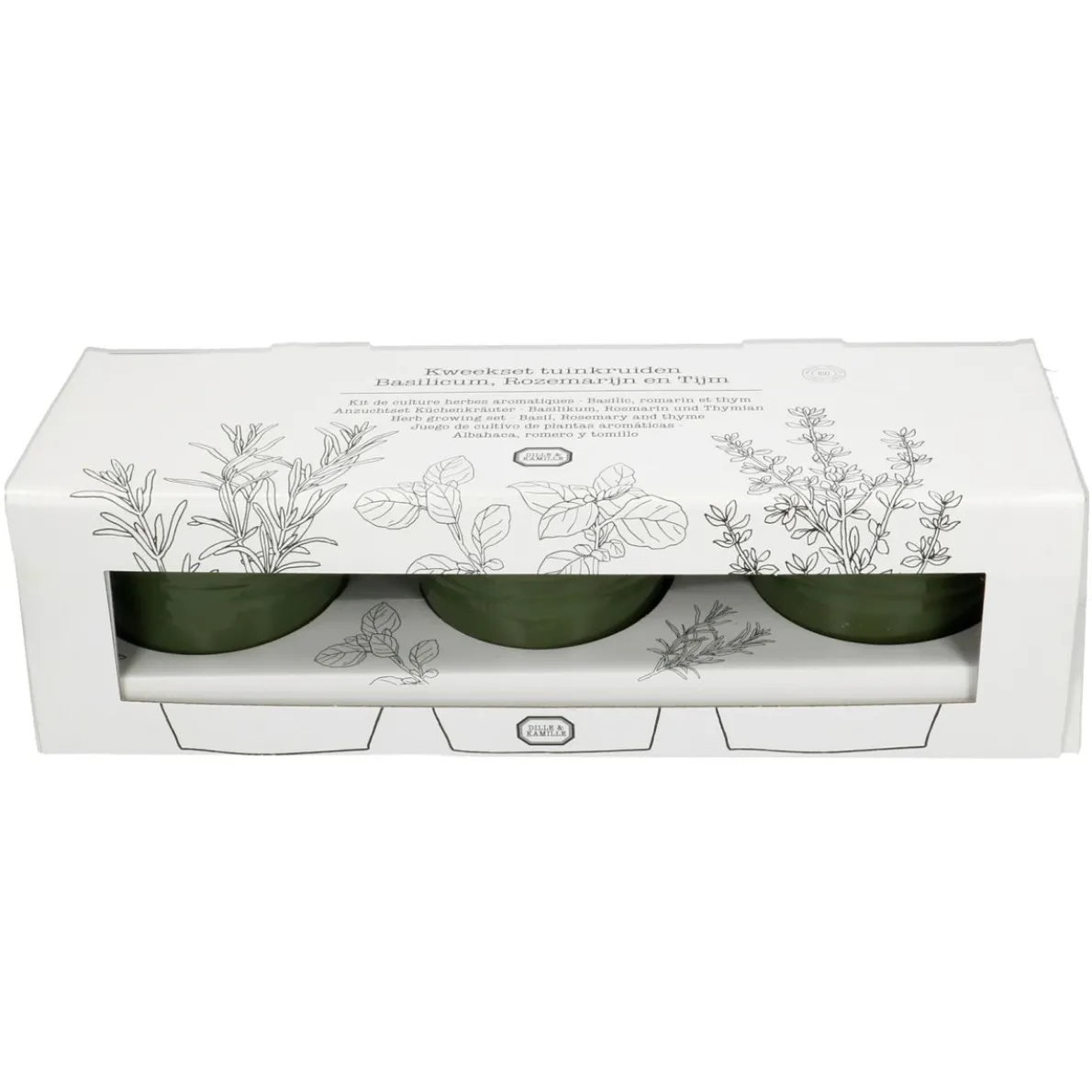 Basilicum, Rozemarijn en Tijm: 3 heerlijke tuinkruiden om bijv. te gebruiken voor bij gerechten of als garnering ervan. Met deze kweekset kun je eenvoudig zelf, in de meegeleverde zinken potjes en met kokostabletten, je eigen tuinkruiden laten groeien op je aanrecht, in de vensterbank of op een andere lichte plek in huis. Voor snel resultaat zaai je eerst binnen voor, op een licht, warme (20°) vensterbank. Als de tuinkruiden volgroeid zijn, kun je ze overplanten in de tuin of op in potten op je terras.