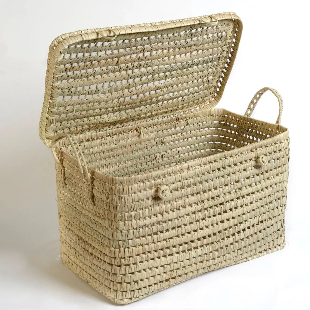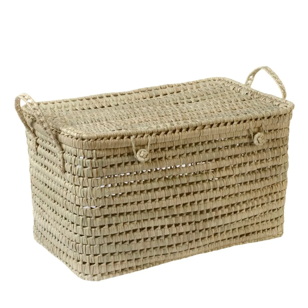 Grote rechthoekige mand met deksel, van open vlechtwerk, met de hand gemaakt van palmblad. Het deksel sluit met 2 lussen en knoppen. Prachtig in je woon- of slaapkamer, voor bijvoorbeeld het opbergen van kussens, dekbedden, speelgoed e.d.