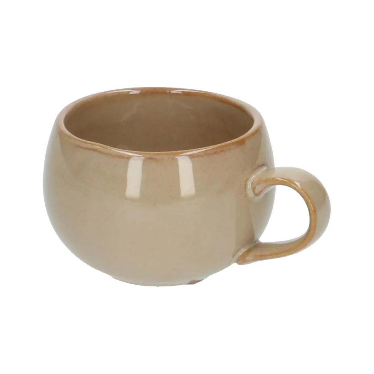 Deze grote,ronde, zandkleurige mok hoort bij onze serviesserie van steengoed met reactief glazuur. Door dit glazuur ontstaat een bijzonder kleurpatroon waardoor ieder item er uniek uitziet en het servies extra glans geeft aan een mooi gedekte tafel.