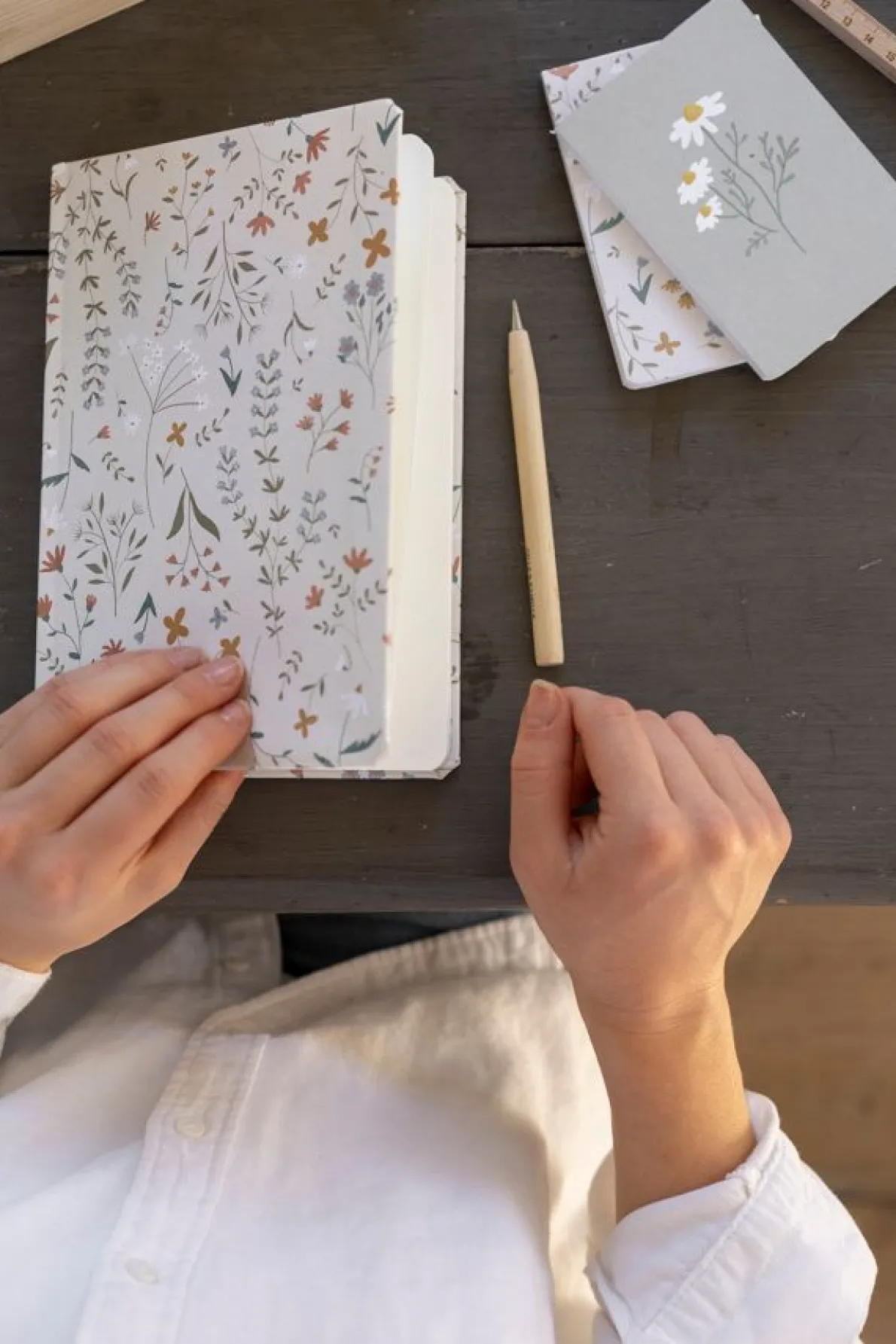 Dit notitieboek bedrukt met veldbloemen heeft een harde kaft en gelinieerd papier. Handig als reisdagboekje, verhalen, voor schetsen of om je favoriete recepten in te schrijven. Het handige elastiek houdt het notitieboek ook in een tas netjes bij elkaar. Het dessin is een ontwerp van Dille & Kamille. De 192 pagina’s zijn genaaid gebonden en het schrift heeft een rechte rug en ronde hoeken.