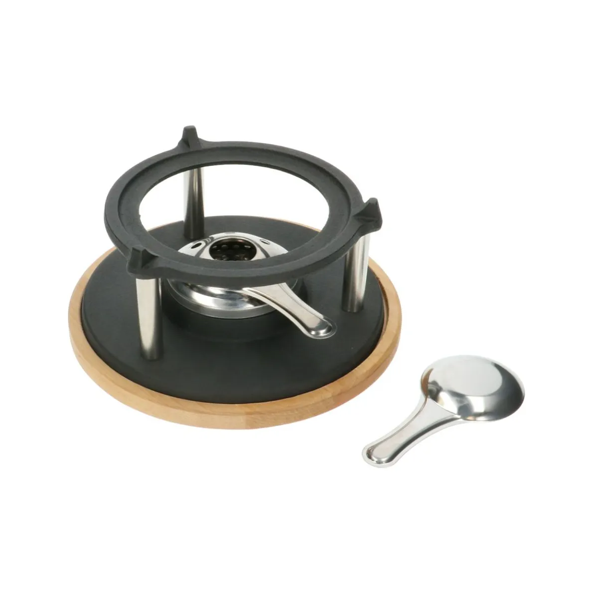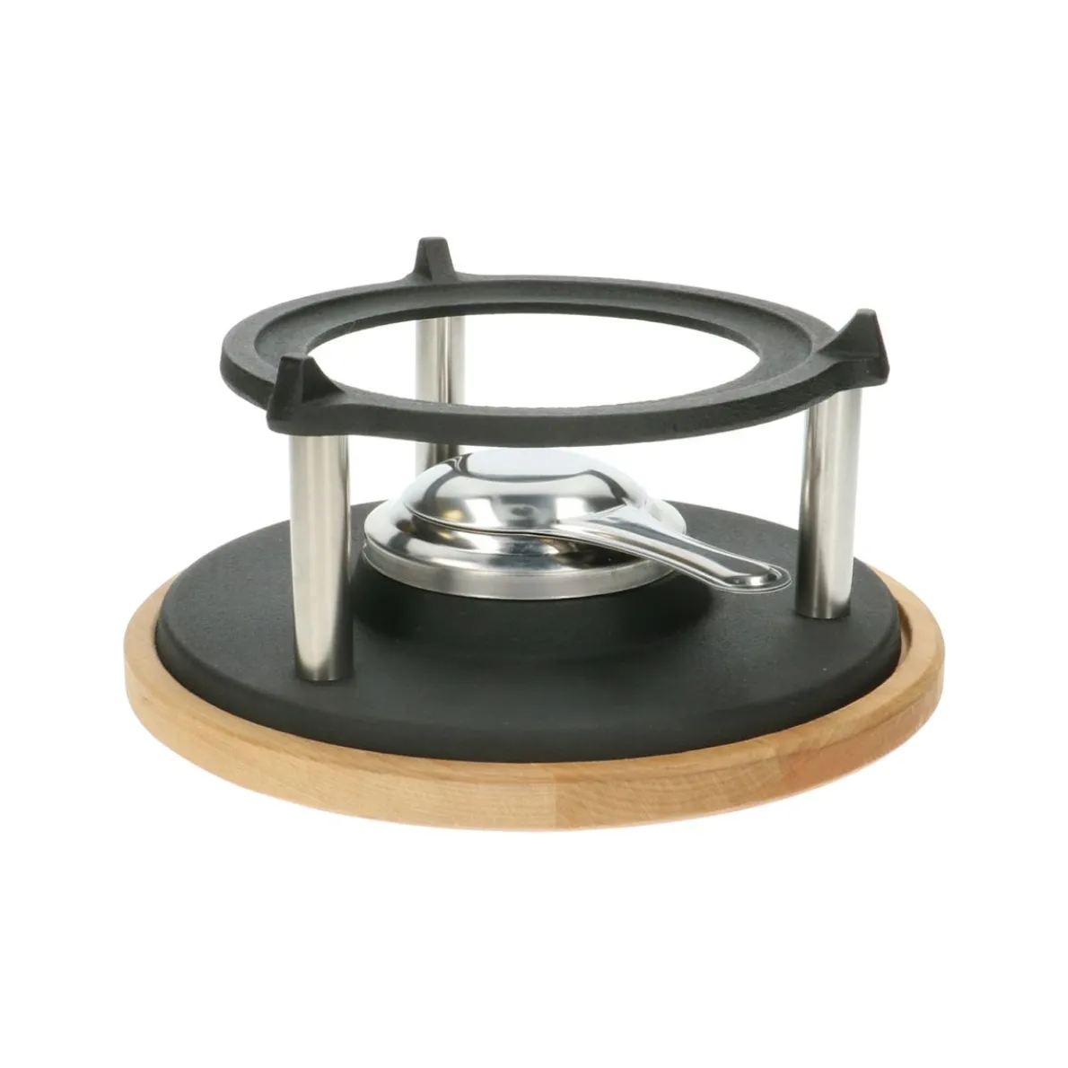 Robuust, gietijzeren onderstel voor onder onze gietijzeren fonduepan, maar ook te gebruiken voor het warm houden van andere pannen, vuurvaste schalen of onze vuurvaste gietijzeren theepot. Het onderstel staat op een houten onderbord dat je ook als snijplank kan gebruiken. Vul de brander met brandgel of brandpasta.