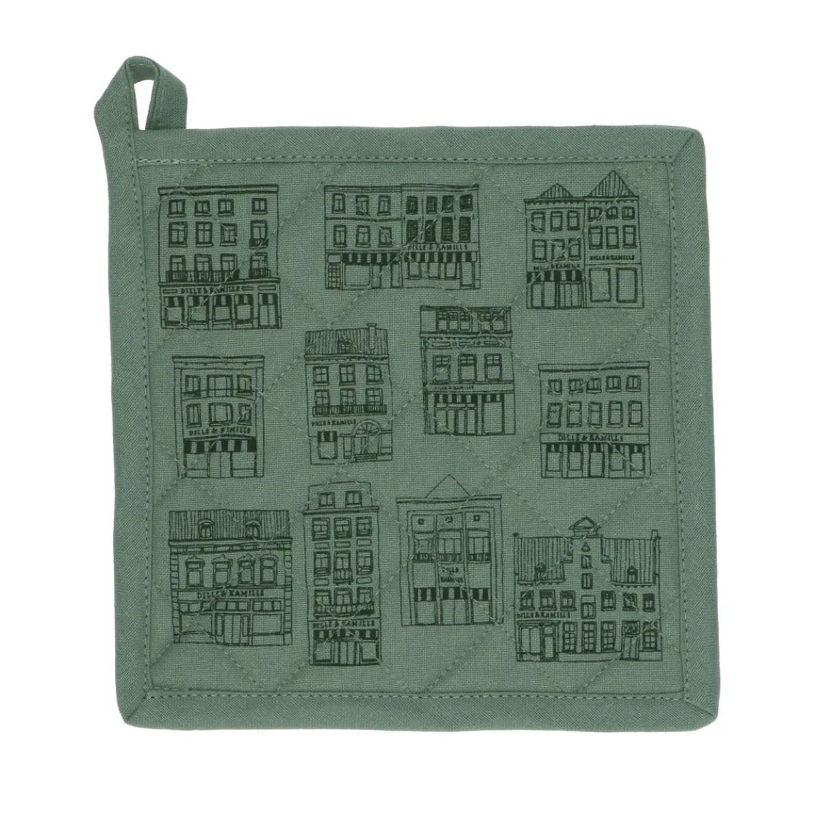 Deze grijsgroene pannenlap bedrukt met geveltjes, houdt warmte goed tegen en beschermt je handen bij het oppakken van hete schalen of pannen. Met handig ophanglusje.