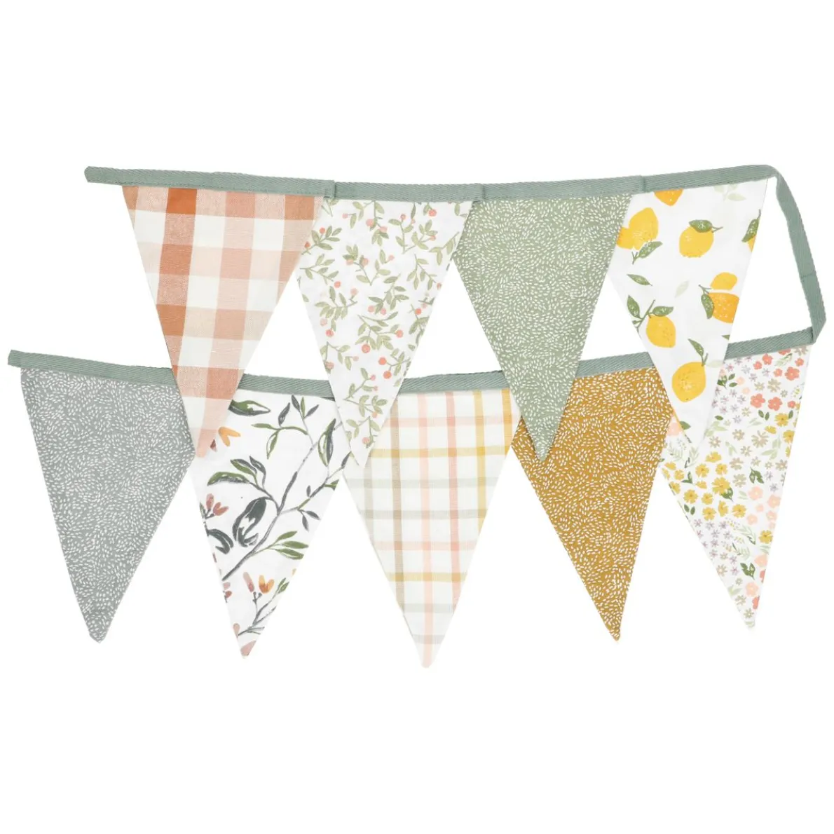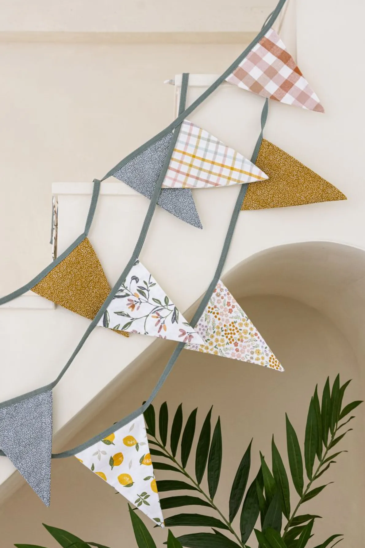 Met deze vrolijke slinger met vlaggetjes in diverse Dille-prints maak je van elke dag een feestje. De slinger is gemaakt van GOTS bio-katoen, dus gaat lekker lang mee. Ook leuk om de speel- of kinderkamer mee op te vrolijken. De vlaggetjes zijn 15 x 20 cm groot en de totale lengte van de slinger is 6 meter.