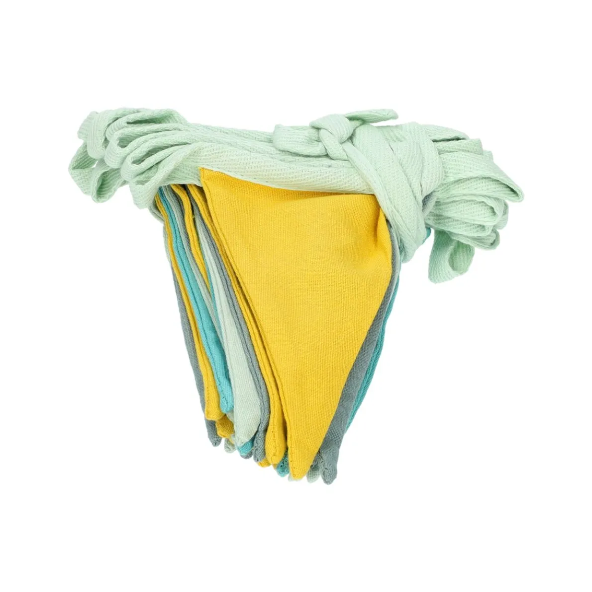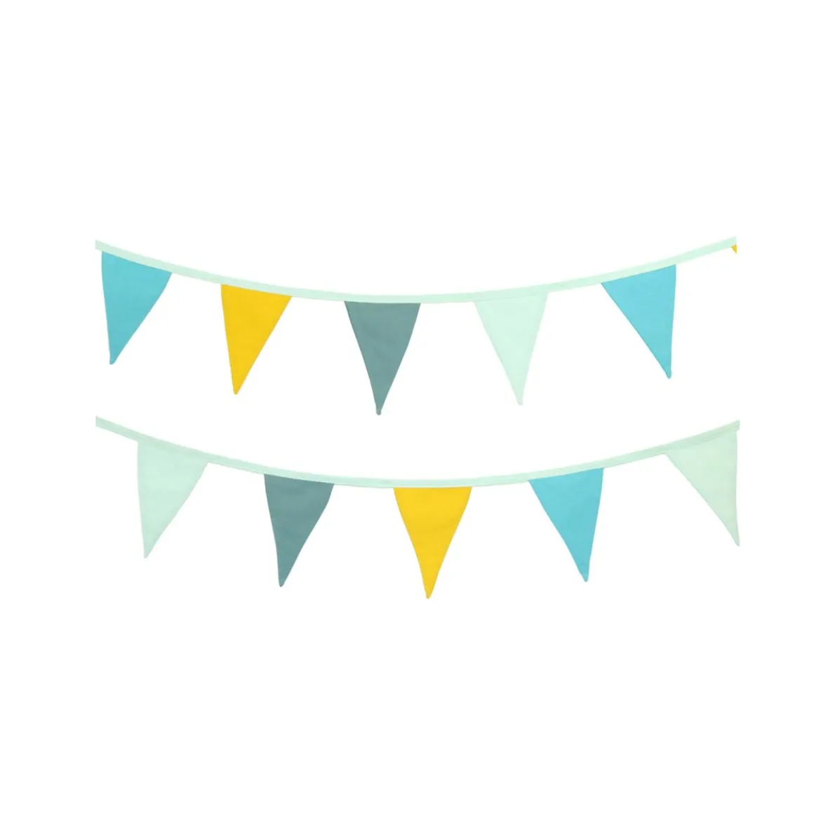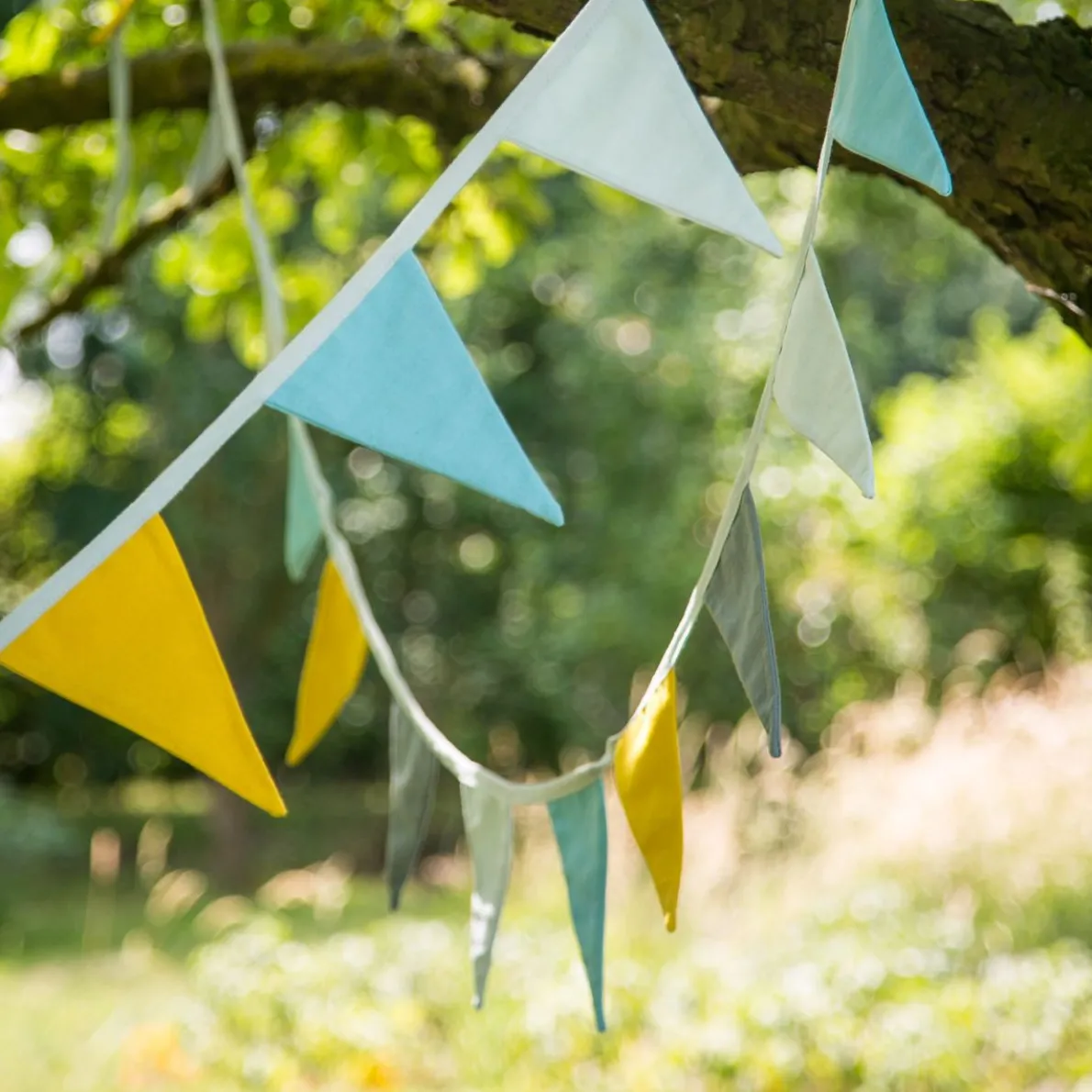 Maak van elke dag een feestje met deze vrolijke vlaggenslinger! Met vlaggetjes in verschillende feestelijke geel- en blauwtinten. De slinger is gemaakt van bio- katoen, dus gaat lekker lang mee. Ook leuk om de speel- of kinderkamer mee op te vrolijken.