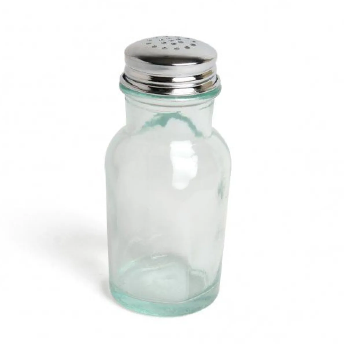 Strooipotje gemaakt van gerecycled glas uit Spanje. Door de verhitting van het glas komt er een chemische reactie tot stand, welke het glaseen specifieke groene kleur geeft. De dop is gemaakt van roestvrij staal. Het potje kan, zonder dop, in de afwasmachine. Afmetingen ca. 4,5 x 10 cm.