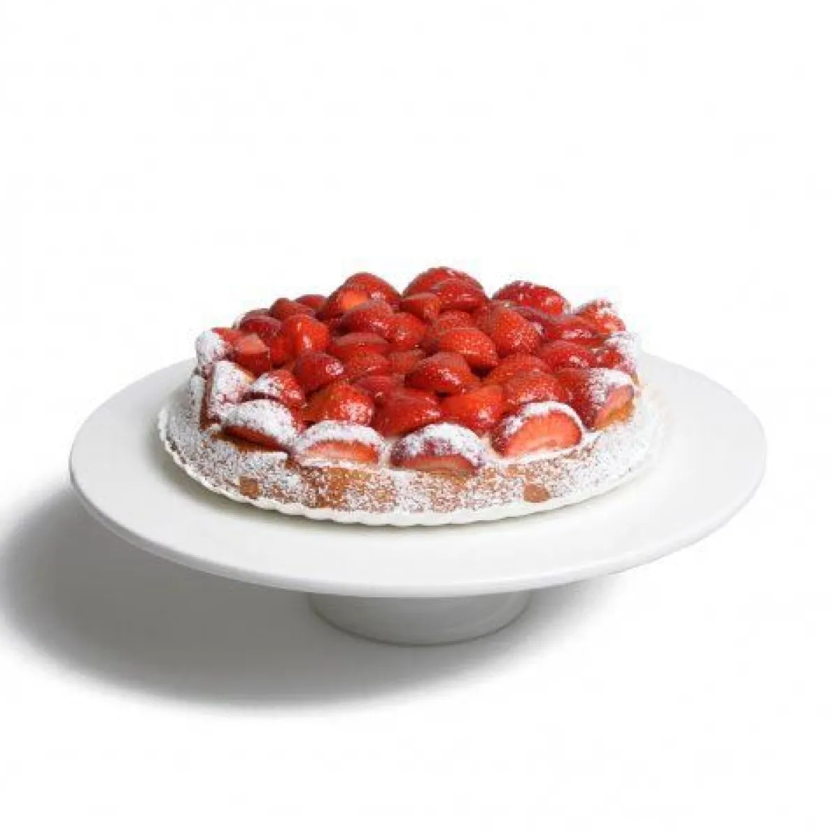 Klassiek rond taartplateau op voet, prachtig om een taart op te serveren maar ook erg mooi voor cupcakes, petits fours, kleine hartige hapjes etc. Wit porselein, door de verlijmde voet niet geschikt voor de afwasmachine. Hoogte ca. 9 cm, Ø 32,5 cm.