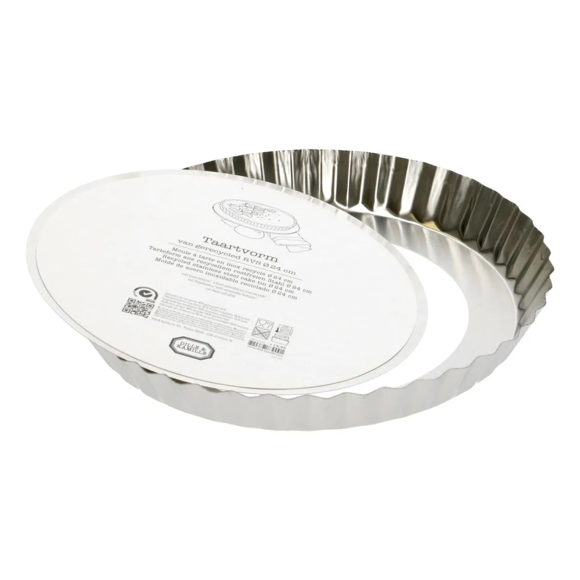 Lage ronde taartvorm gemaakt van sterk gerecycled roestvast staal. Deze vorm heeft een geschulpte iets uitlopende rand en is heel geschikt voor bijvoorbeeld een klassieke vruchtentaart of citroen merinque taart. Door de losse bodem kan de taart na het bakken makkelijk van onder uit de vorm worden geduwd.