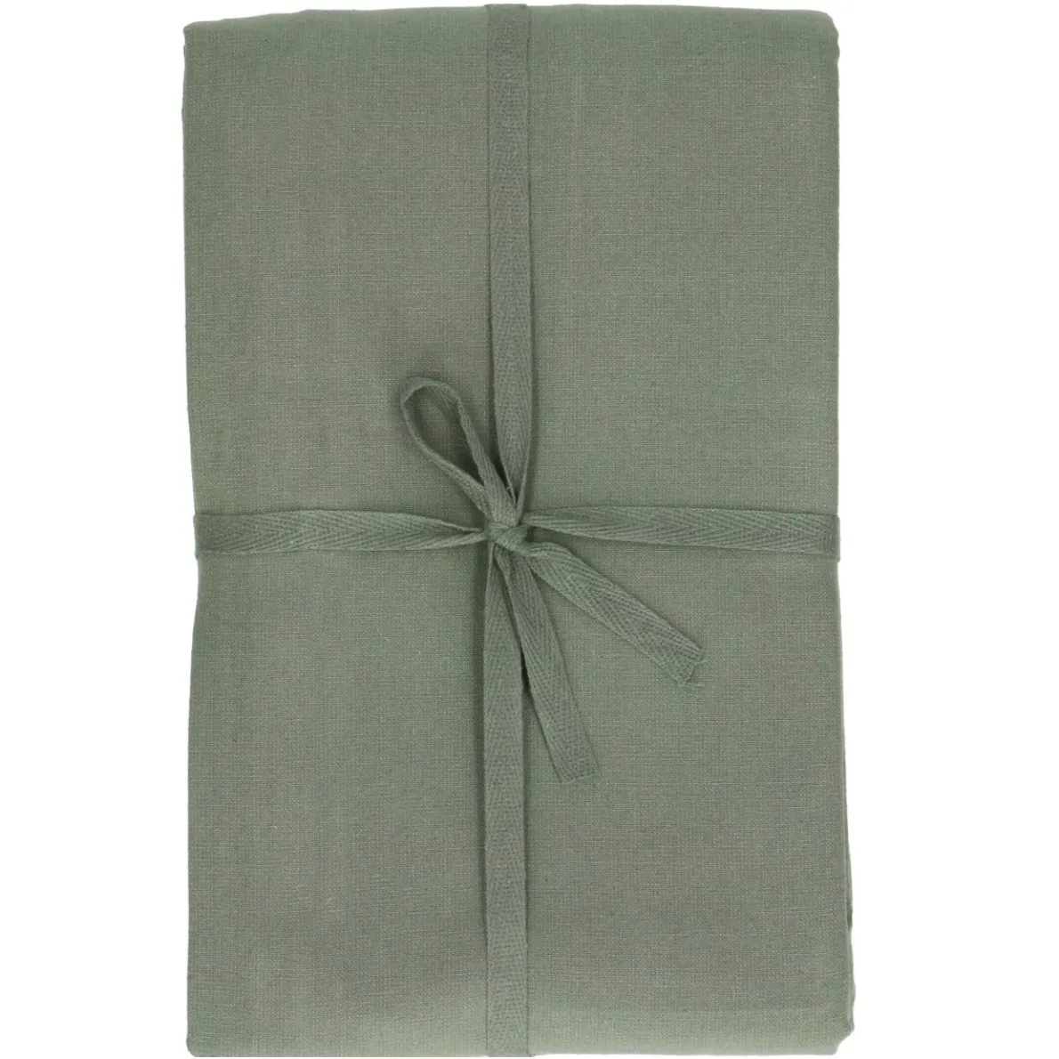 Groot, tijmgroen tafelkleed, geschikt voor een rechthoekige tafel voor zes tot acht personen.