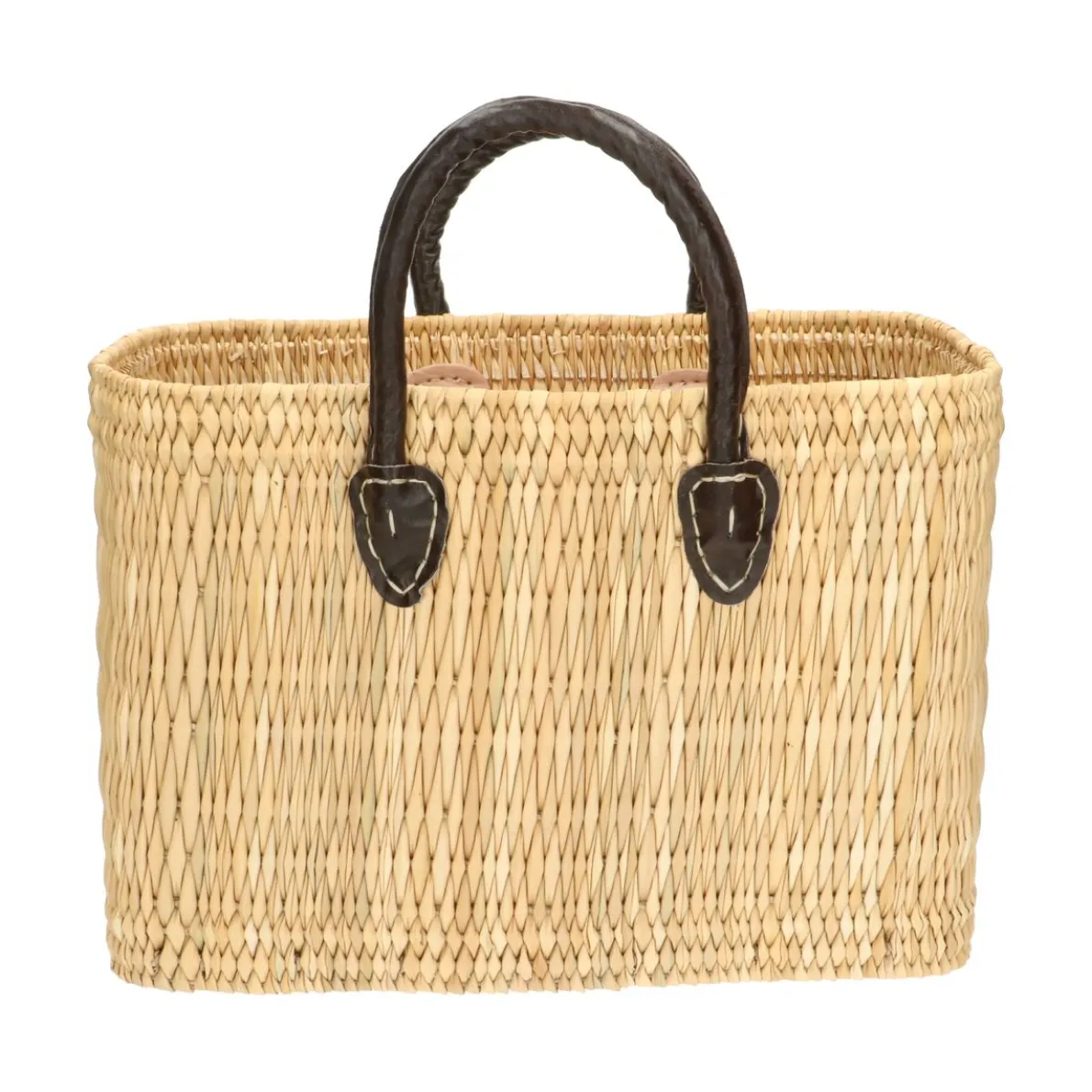 Handgevlochten (boodschappen)tas van pitrusgras, met bruin lederen hengsel. Gemaakt in Marokko. Afmetingen ca. 40 x 15 x 26,5 cm (exclusief hengsel). Draaglengte hengsel ca. 10 cm. Omdat dit een handgemaakt ambachtelijk product is, kunnen de afmetingen van tas tot tas enigszins verschillen.