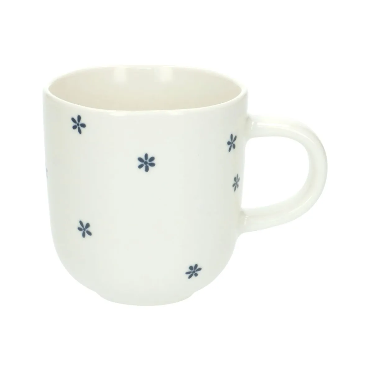 Met deze mooie theemok, bedrukt met blauwe bloemetjes, geniet je nog meer van je kop thee. De mok is onderdeel van een serviesserie bestaande uit een beker, ontbijtbordje, kommetje en deze theemok. Een mooi organisch servies van porselein en verkrijgbaar in drie verschillende dessins. De donkerblauwe bloemetjes zijn een decal. Dit is een speciale folie dat op hoge temperatuur in de oven op het servies wordt gebrand. Het servies kan daardoor in de vaatwasser. De verschillende printjes – ontworpen door Dille & Kamille – passen leuk bij elkaar, maar zijn ook een mooie aanvulling op ons organisch gevormde witte servies.