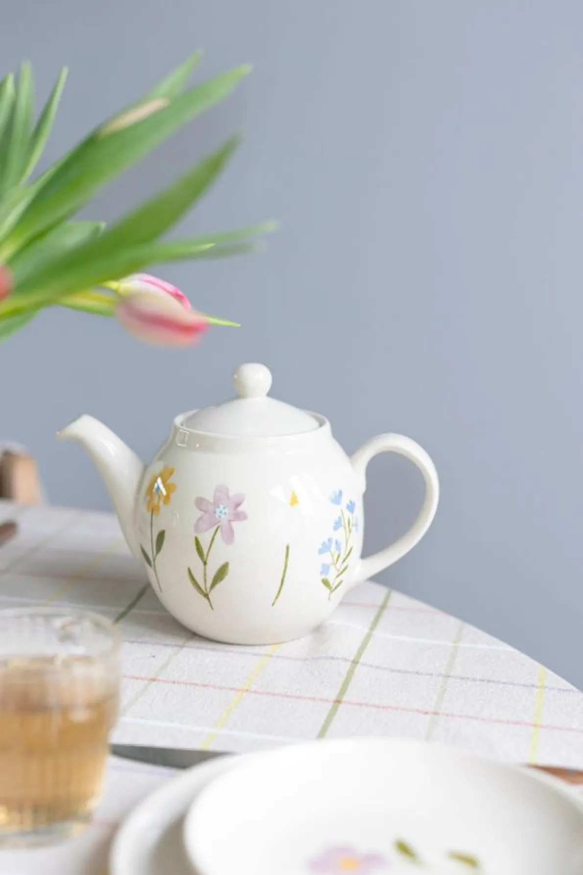 Geniet van gezellige thee-momenten met deze mooie theepot met handgeschilderde wilde bloemen. Deze theepot is onderdeel van een serviesserie. Steengoed is een extra sterke soort aardewerk. Het dessin is een eigen ontwerp van Dille & Kamille. Erg mooi in combinatie met de andere onderdelen van dit servies of ons effen ‘beige spikkel’ servies.