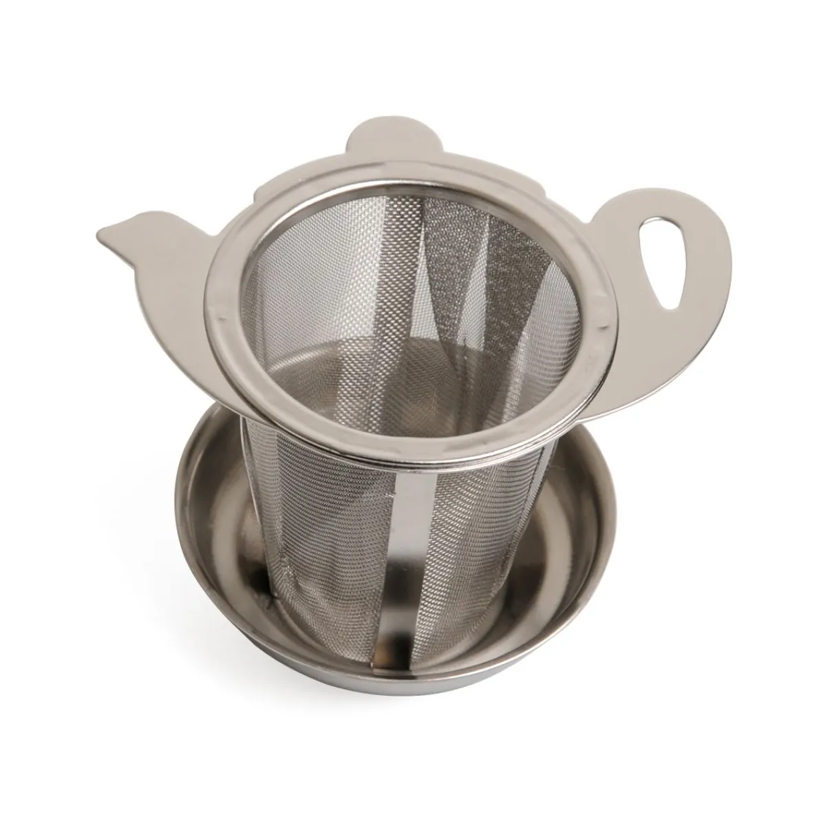 Theezeefje met brede rand in de vorm van een theepot, voor o.a. losse thee en kruidenthee. Je zet de lekkerste thee met losse theeblaadjes, deze geven optimaal hun geur en smaak af. Vul het theezeefje voor de helft met losse thee zodat de blaadjes voldoende ruimte hebben om zich te ontvouwen, zet vervolgens het zeefje in de opening van de theepot. Roestvrij staal geschikt voor de afwasmachine. Lengte 7 cm, Ø opening 5,5 cm, Ø met rand 7 cm. Afmetingen uitlekbakje, hoogte 2 cm, Ø 7,5 cm.