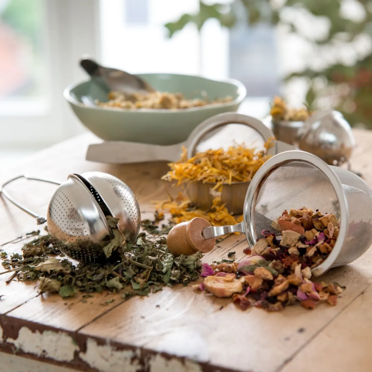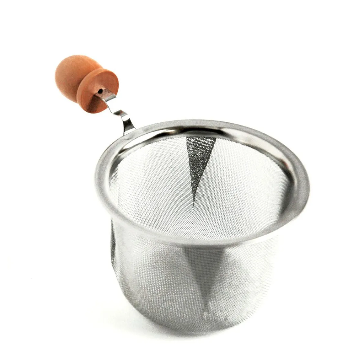 Theezeefje van roestvrij staal met een houten knopje, voor o.a. losse thee en kruidenthee. Losse theeblaadjes geven de meeste smaak aan thee. Vul het zeefje voor de helft met losse thee zodat de blaadjes voldoende uit kunnen zetten, zet vervolgens het zeefje over de opening in de theepot. Niet geschikt voor de afwasmachine. Lengte 4 cm, Ø 6 cm.