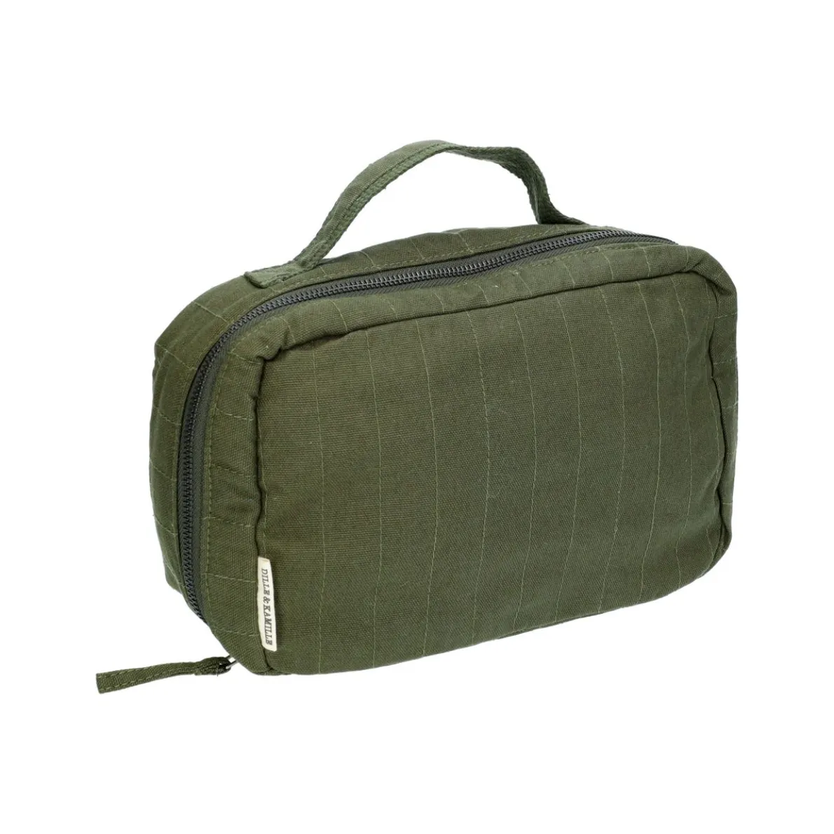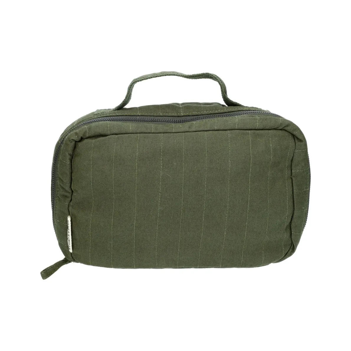 In deze donkergroene toilettas met ritssluiting kun je al je favoriete toiletspullen kwijt. Dankzij het handige en ruime formaat is hij makkelijk mee te nemen in je tas of koffer. Ideaal om mee op reis te nemen. De toilettas is gemaakt van zacht biologisch katoen met stiksels. Leuk om te combineren met het kleine toilettasje om je make-up en andere kleine spullen in mee te nemen.