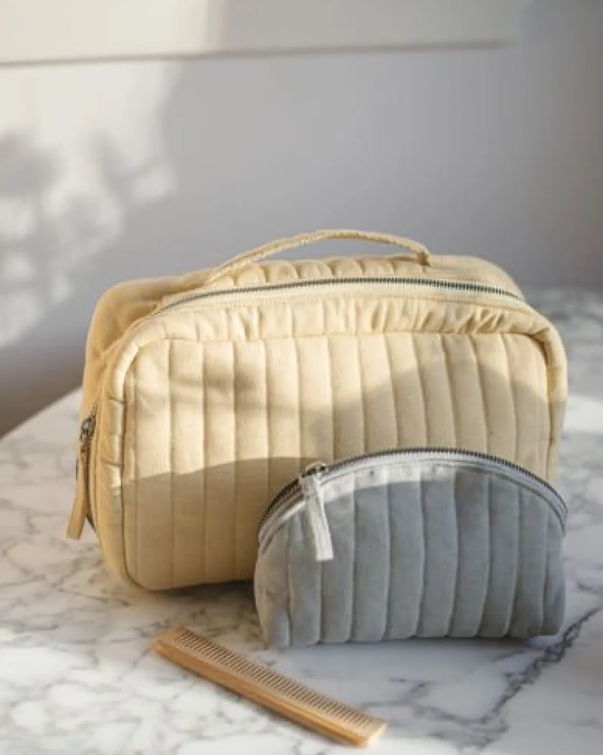 In deze grijsblauwe toilettas met ritssluiting neem je makkelijk je favoriete make-up of kleine spullen mee. Dankzij het compacte formaat past hij makkelijk in je (hand)tas of koffer. Ideaal voor een dagje uit of weekend weg. De toilettas is gemaakt van zacht biologisch katoen met stiksels. Leuk om te combineren met de grote toilettas om andere toiletartikelen en accessoires mee op reis te nemen.