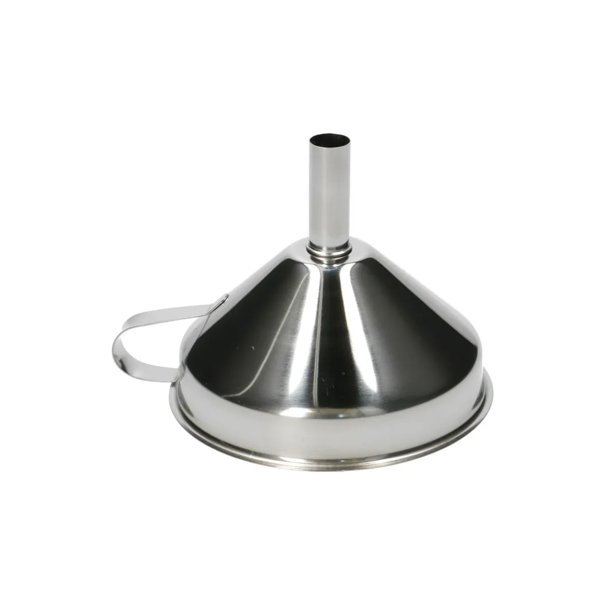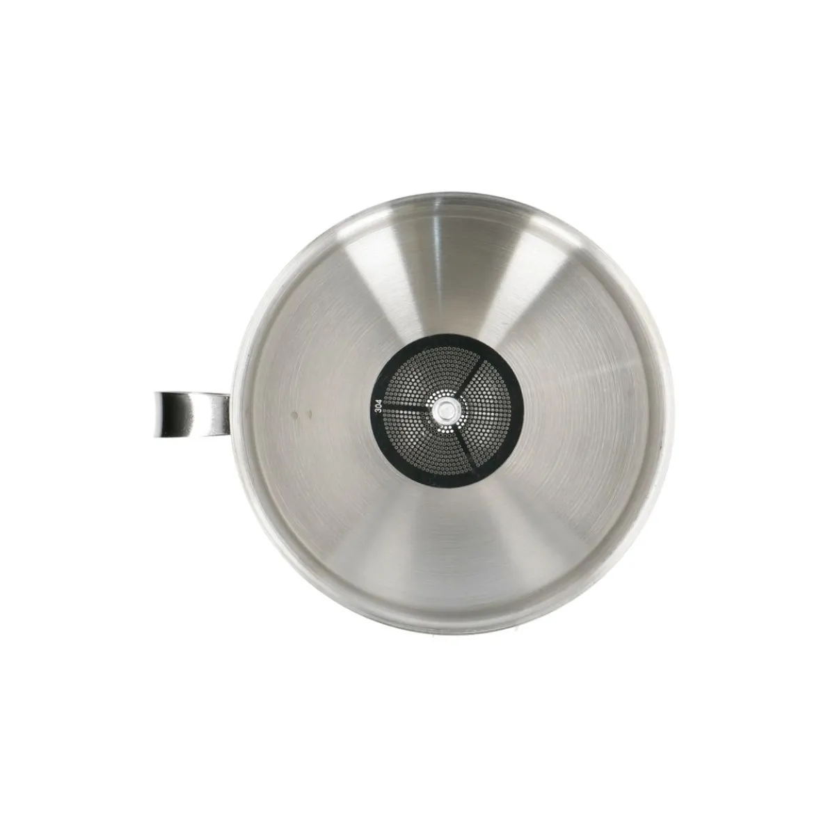 Trechter met zeefje, roestvrij staal, met handvat en een smalle opening. Om bv. zelfgemaakte vruchtensappen in een fles over te brengen. Het handig zeefje plaats je gemakkelijke in de trechter. Geschikt voor de afwasmachine.