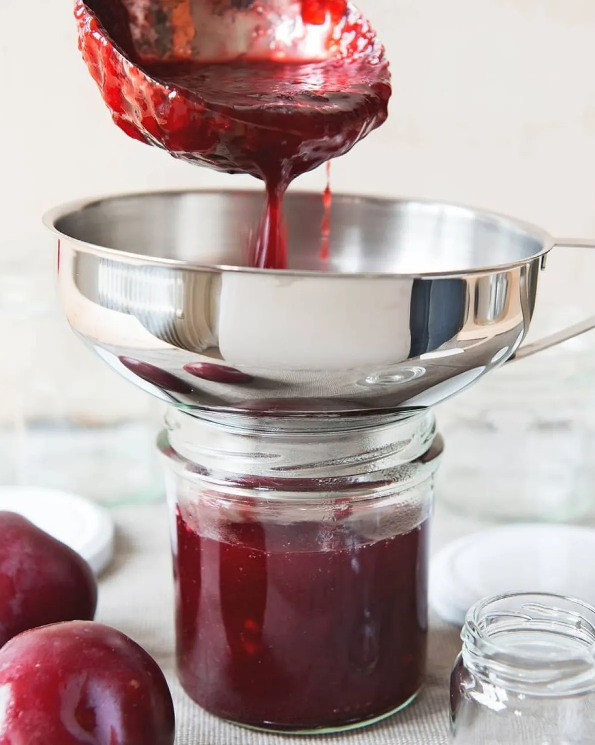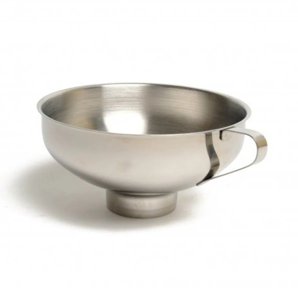 Jamtrechter, roestvrij staal, met handvat en een brede opening (Ø 5 cm). Om bv. zelfgemaakte jams, chutneys, sappen etc. in een weckpot of -fles over te brengen. Geschikt voor de afwasmachine. Hoogte 7 cm, Ø 14 cm.