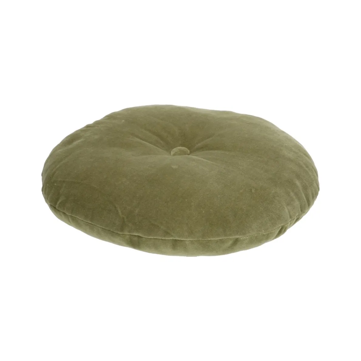 Mooi mosgroen gekleurd (stoel)kussen van zacht velours met knoop in het midden.