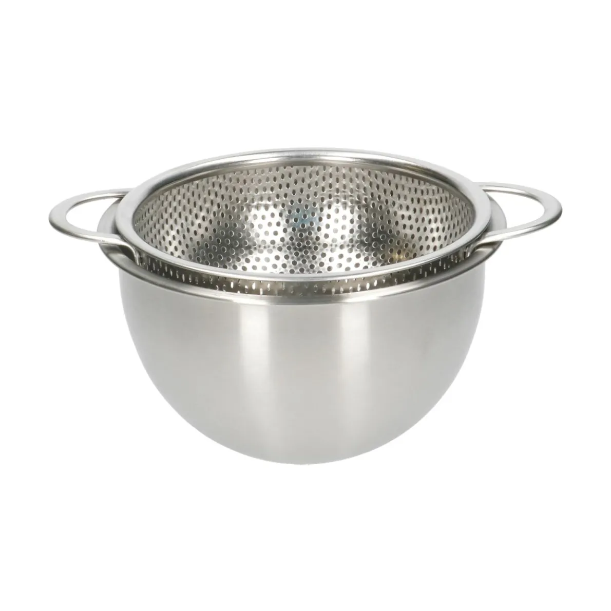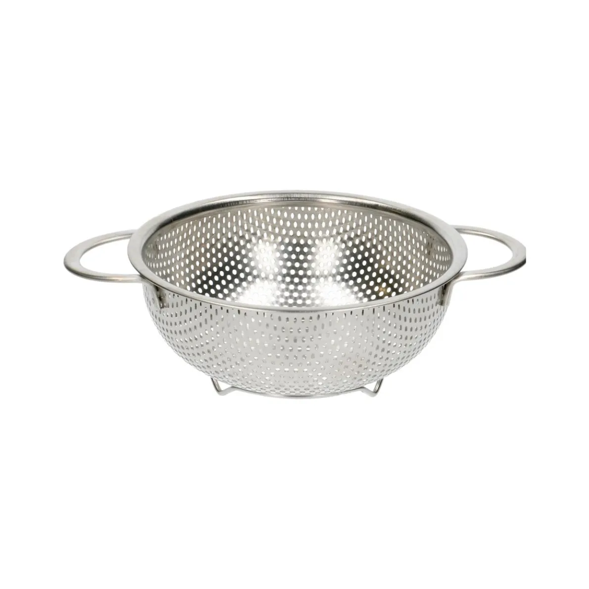 Kleine bol vergiet van rvs met 2 handgrepen. Het vergiet heeft over het hele oppervlak gaatjes zodat je bijvoorbeeld gewassen sla, groente en fruit etc. snel kan laten uitlekken. Dankzij de 3 pootjes blijft de inhoud niet in het water staan.Tip: Het vergiet past in onze rvs (meng)kom van Ø 16 cm. Dat scheelt ruimte in je keukenkastje.Het is ook handig als je bv. vóór het verwerken groente of sla wil opfrissen/blancheren in koud water. Vul de kom met water en zet het gevulde vergiet er in. Til het vergiet uit de kom en de inhoud is meteen uitgelekt.