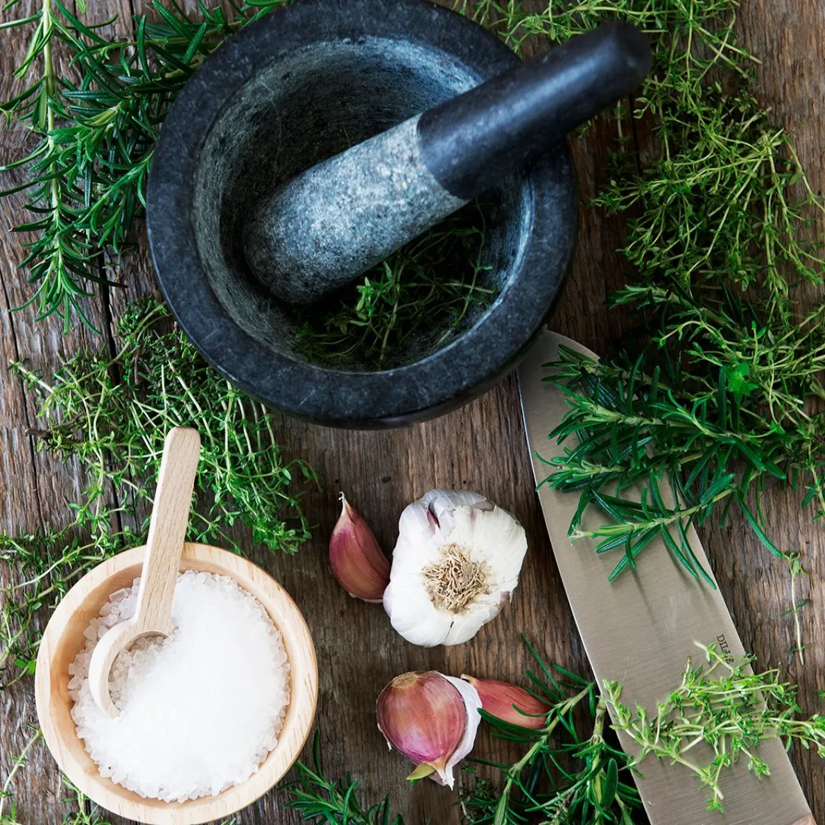 Vijzel en stamper van zwart graniet. De stamper en binnenzijde van de vijzel zijn enigszins ruw, om moeiteloos kruiden, specerijen, knoflook etc. fijn te stampen of te wrijven. De kom van de vijzel is ruim genoeg om ook bv. pesto, mayonaise, Aziatische currypasta’s en boemboe’s te maken. Hoogte 9 cm, Ø 13 cm. Gewicht 2,4 kg. Bekijk hier de gebruiksaanwijzing met onderhoudstips voor de vijzel.