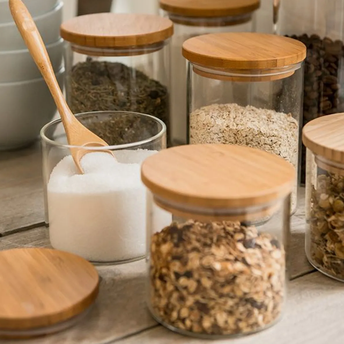 Glazen voorraadpot met bamboe deksel. Sluit luchtdicht af dankzij de doorzichtig plastic afsluitring. Om bv. suiker, bloem of rijst in te bewaren. Door de luchtdichte afsluiting blijft de inhoud vers. Geschikt voor de afwasmachine, deksel met de hand afwasssen. Hoogte 9,5 cm, Ø 10 cm. Inhoud 450 ml.