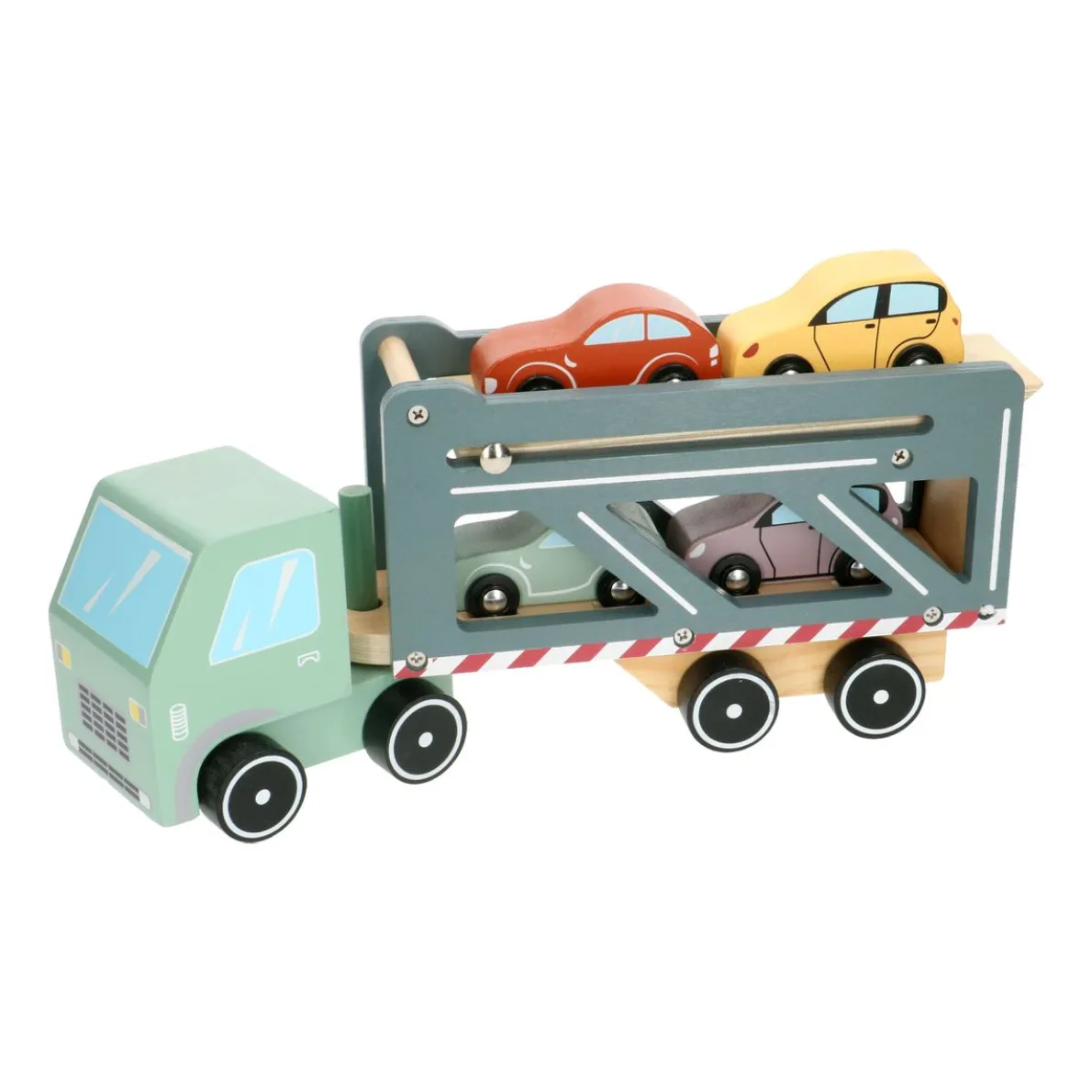 Met deze prachtige set van vrachtwagen met oplegger en 4 autootjes kunnen kinderen eindeloos blijven spelen en fantaseren.