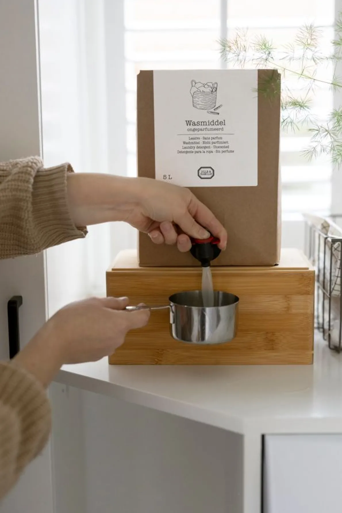 Geconcentreerd, milieuvriendelijk vloeibaar wasmiddel op basis van pure Marseille-zeep en dubbelkoolzure soda. Dit parfumvrije wasmiddel is mild voor alle soorten textiel en houdt je kleding langer mooi. Het bevat geen parabenen, EDTA, sulfaten en palmolie.Tip: Voor een heerlijke, natuurlijke geur doe je 3-5 druppels wasparfum bij je was.Met de 5 liter bag in box verpakking, kun je thuis je fles navullen. Of gebruik het handige kraantje om het wasmiddel direct in de wasmachine te doseren. Zet de kartonnen doos op een plank of een stevige verhoging. Met een bag in box bespaar je niet alleen geld, je bespaart ook 80% plastic afval. De hele verpakking is recyclebaar. De doos kan worden hergebruikt of bij het oud papier. De zak en het kraantje, mogen bij PMD-afval, of bij restafval als in jouw gemeente plastic niet apart wordt ingezameld. Als de zak bijna leeg is rol je hem van boven naar beneden op om het laatste beetje wasmiddel richting het kraantje te duwen. Voor ongeveer 150 wasbeurten.